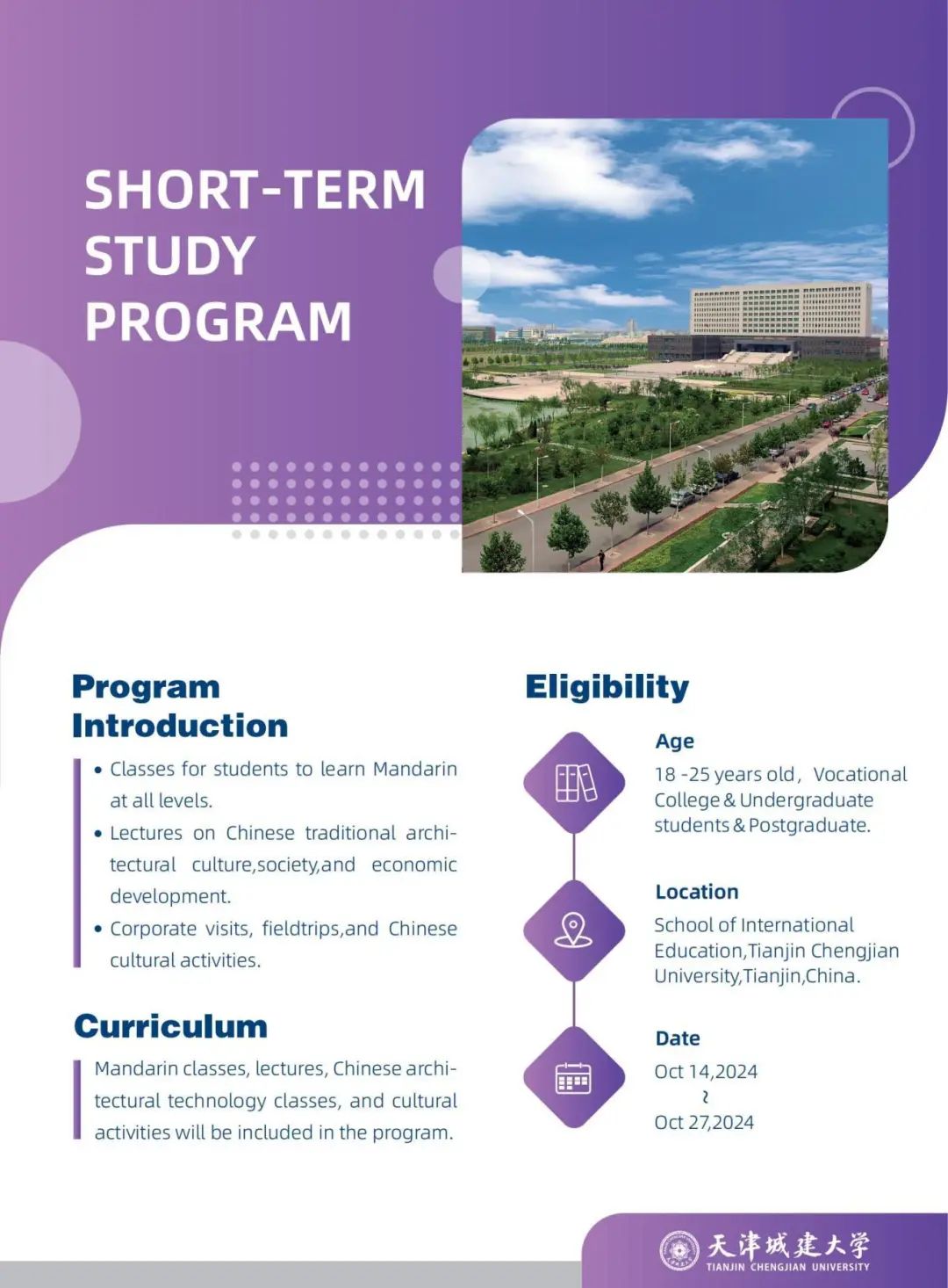 bv伟德短期学习项目包括汉语学习、中国文化体验和中国建筑技术等3个主题活动,项目时长2周,围绕天津历史建筑和城建文化等主题开展汉语文化体验活动和建筑业相关技术宣讲,让留学生在体会汉语独特的魅力的同时,感受兼具传统和现代特色的中华建筑文化,更全面、深入地了解当代中国。