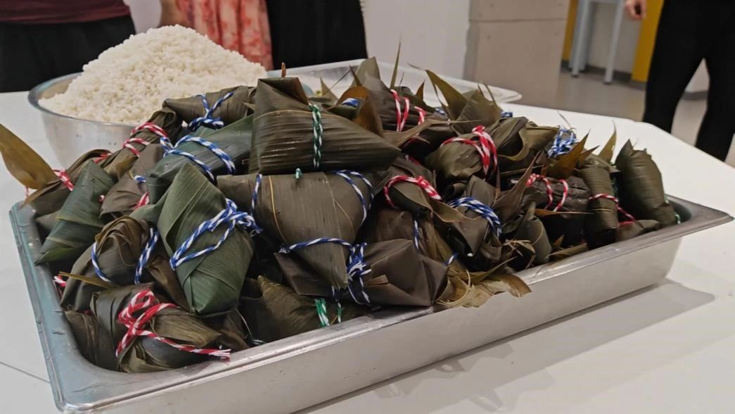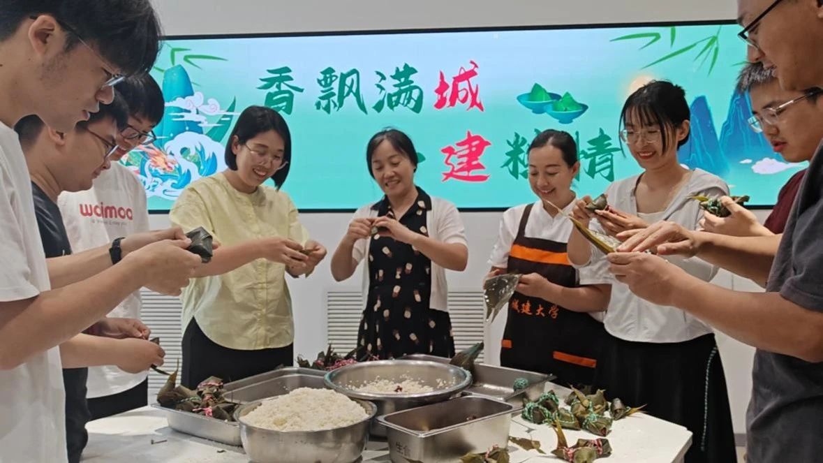 在专业师傅的指导下,老师和同学们亲手体验了包粽子的全过程。他们洗净粽叶,挑选糯米、红枣、豆沙等馅料,认真折叠、包裹,一个个形状各异的粽子在大家手中逐渐成形。虽然手法略显生疏,但每个人都乐在其中,感受着传统文化的魅力。在体验包粽子的过程中,大家交流着端午诗词,有的同学还现场朗诵了《离骚》《九歌》等,用诗歌表达了对屈原的敬仰和对传统文化的热爱。现场师生亲切地分享各自家乡的端午节习俗,讲述着关于端午节的趣事和传说。