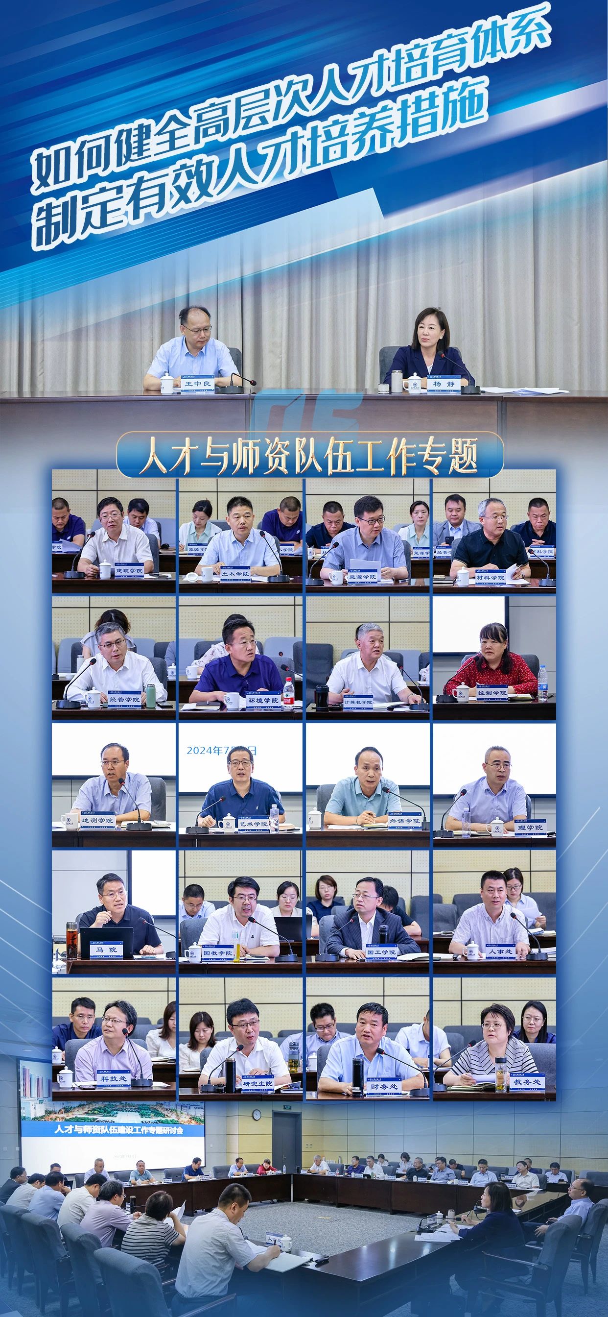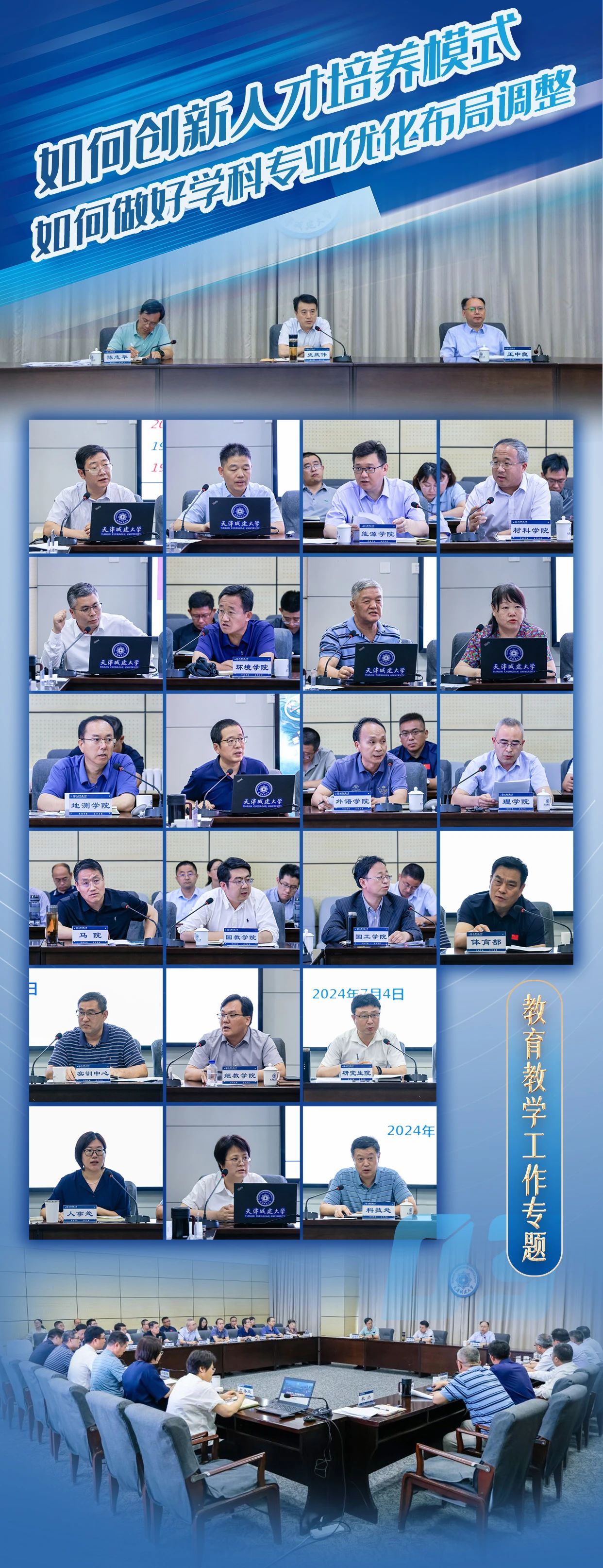 会上,校长王中良以习近平新时代中国特色社会主义思想为指导,深入学习宣传贯彻习近平总书记视察天津重要讲话精神,作《主动识变敢于破局释放活力,开创学校高质量发展新局面》中期报告,从党建思政、人才培养、研究生教育和学科建设、科研创新、师资队伍、国际交流、治理水平等七个方面,总结了学校今年上半年取得的工作成效。深入分析了当前学校发展面临的新形势、新挑战,强调发展新质生产力是推动高质量发展的重要引擎,教育、科技、人才三位一体推进是快速发展新质生产力的实现路径,高等教育作为人才第一资源、科技第一生产力、创新第一动力的重要结合点,深化新时代高等教育综合改革已成为时代呼唤。