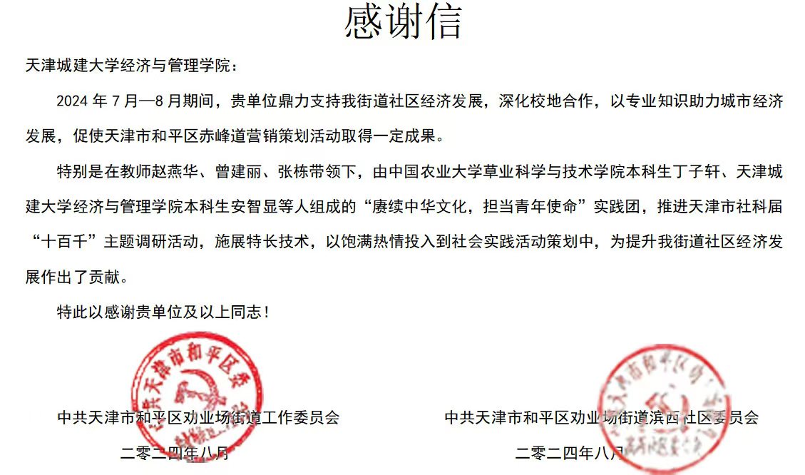 此次活动由教师曾建丽牵头,负责沟通对接。实践团由教师赵燕华、张栋,本科生安智显、中国农业大学草业科学与技术学院本科生丁子轩等人组成,依托天津市社科界“十百千”主题调研活动课题“建立‘党建+志愿服务’工作机制,提升基层治理新效能”,活动旨在通过调研,为赤峰道制定营销策划方案,推动街区文商旅居进一步融合,繁荣后街经济,助力区域经济向纵深发展。