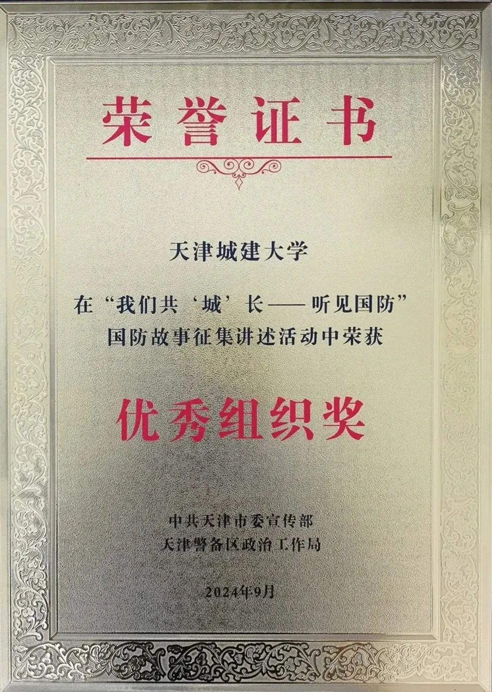 近日,由市委宣传部、天津警备区政治工作局、市教委、市委网信办、市委市级机关工委、市退役军人局、市国资委、市国动办、团市委共同主办的“我们共‘城’长——听见国防”国防故事征集讲述活动集中展示暨颁奖仪式圆满落幕。学校计算机与信息工程学院邢赵微参赛作品《那些戍守边关的日子》荣获大赛二等奖,国际工程学院赵奕然参赛作品《跨越时空的坚守》荣获大赛优秀奖,学校荣获“优秀组织奖”。