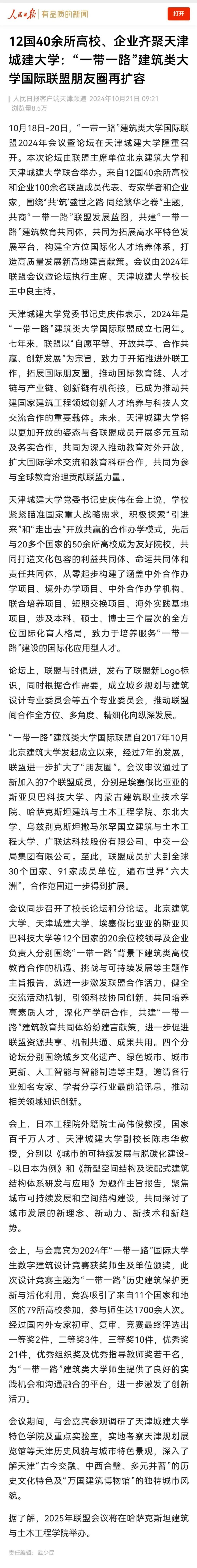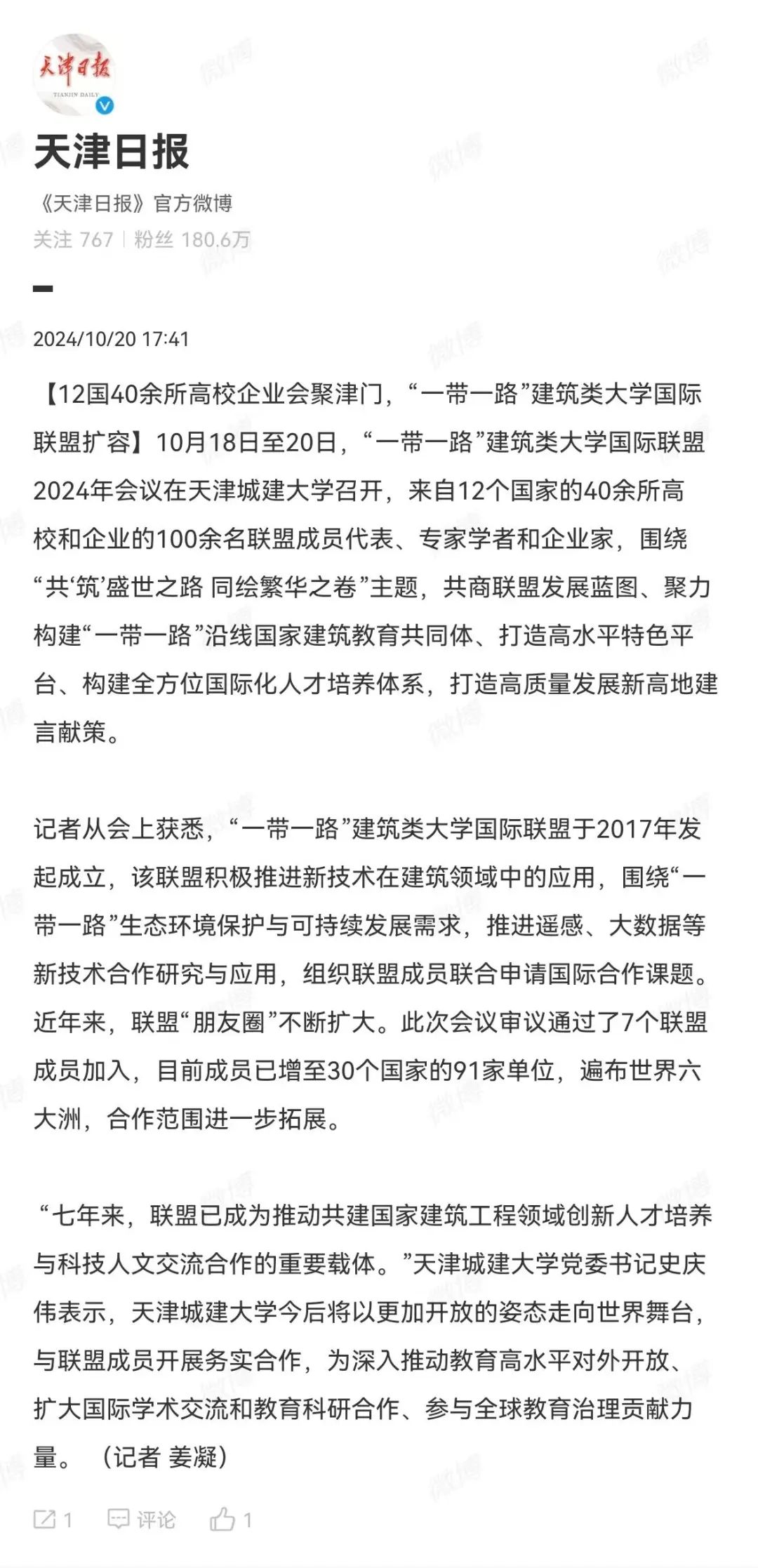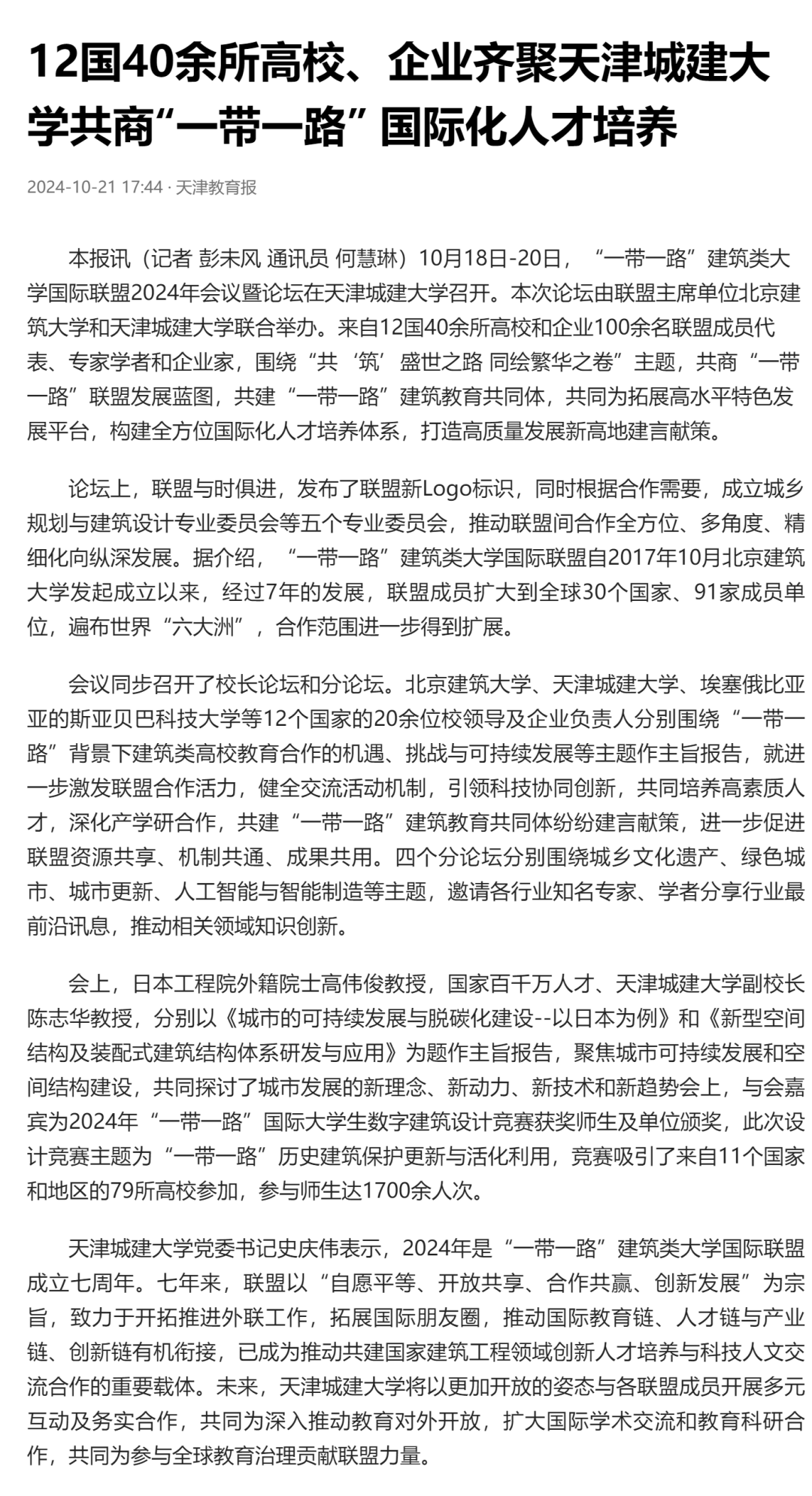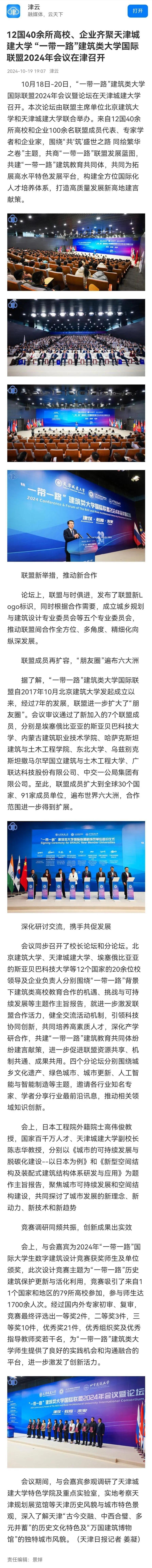 10月18日-20日,“一带一路”建筑类大学国际联盟2024年会议暨论坛在bv伟德隆重召开。来自12个国家的20余位大学校长和企业家、40余所高校与机构的百余名联盟成员代表,围绕“共‘筑’盛世之路 同绘繁华之卷”主题,共商“一带一路”联盟发展蓝图,共建“一带一路”建筑教育共同体,共同为拓展高水平特色发展平台,构建全方位国际化人才培养体系,打造高质量发展新高地建言献策。会议受到了人民日报、新华社、光明日报、中国日报、中国新闻网、中国青年报、中国教育新闻网、天津日报、津云、天津教育报等多家媒体宣传报道。