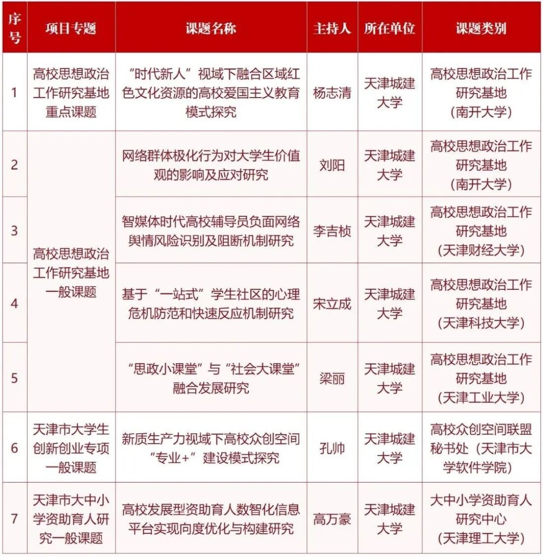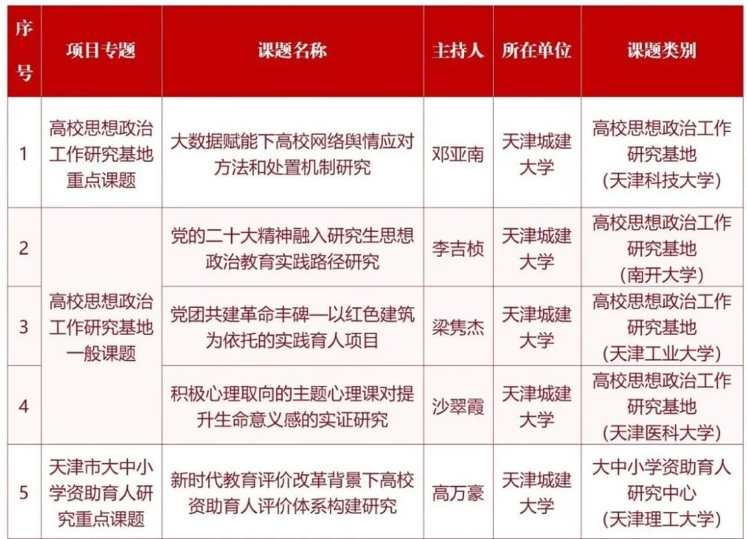 近日,市教育两委公布了2023年天津市大中小思想政治工作专项课题结项和2024年大中小思想政治工作专项课题立项名单。经专家组评审,bv伟德5个课题顺利获批结项;在2024年度大中小思想政治工作专项课题中,7个课题获批立项,其中重点课题1项,一般课题6项。