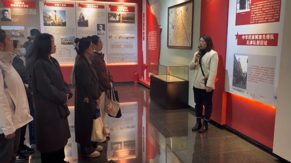 在革命丰碑展馆,马克思主义学院青年教师崔梦影和李阳以天津革命历程为主线,深情讲述了天津红色旧址背后感人的革命故事和革命先烈的英勇事迹,展示了一堂生动而深刻的思政课。