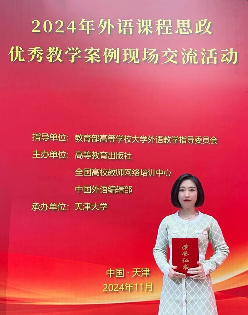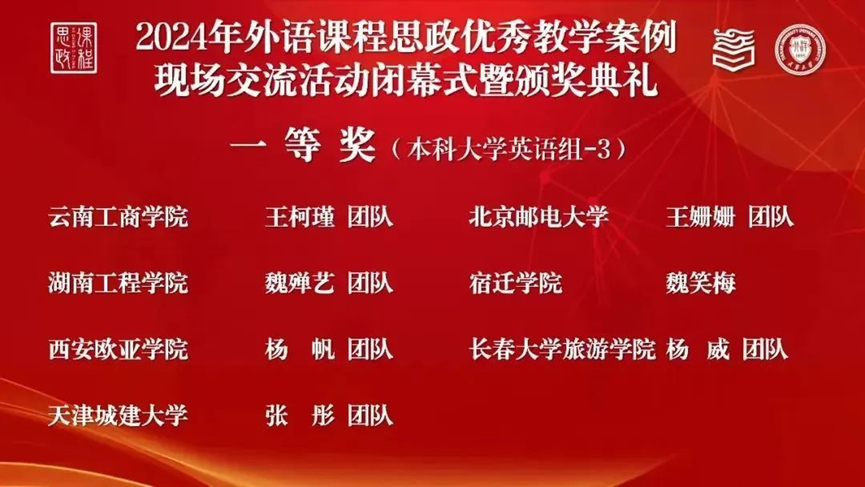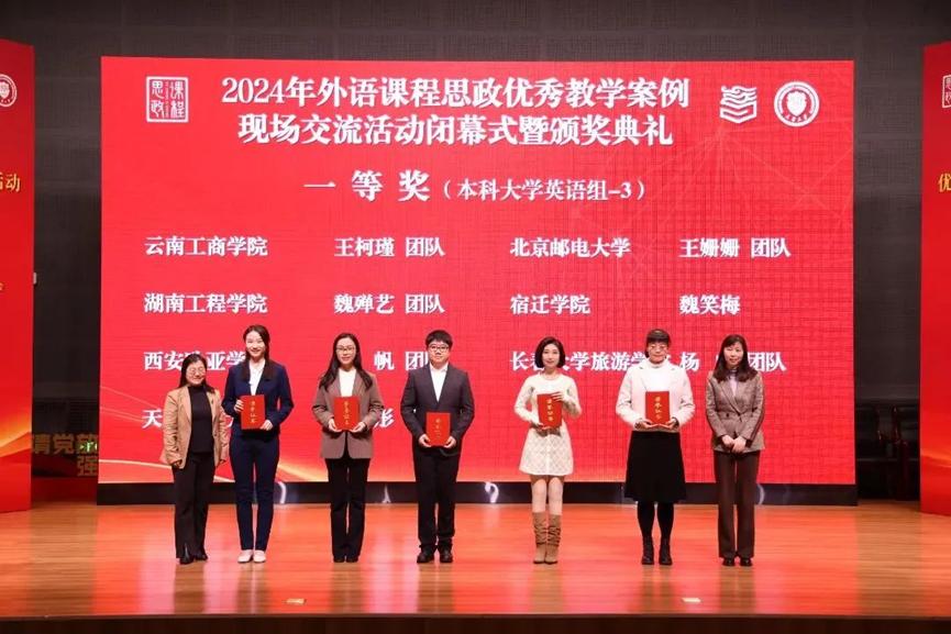 近日,2024年外语课程思政优秀教学案例现场交流活动(以下简称活动)在天津大学顺利落下帷幕。本次活动由教育部高等学校大学外语教学指导委员会指导,高等教育出版社、全国高校网络培训中心和中国外语编辑部主办。bv伟德外国语学院张彤教师团队(张彤、时园园、朱姗、甘莹)荣获国赛一等奖。