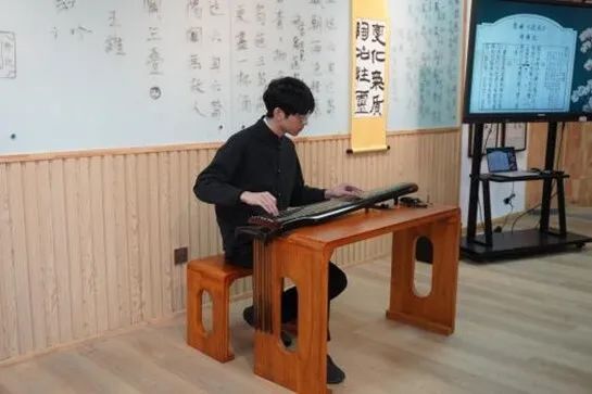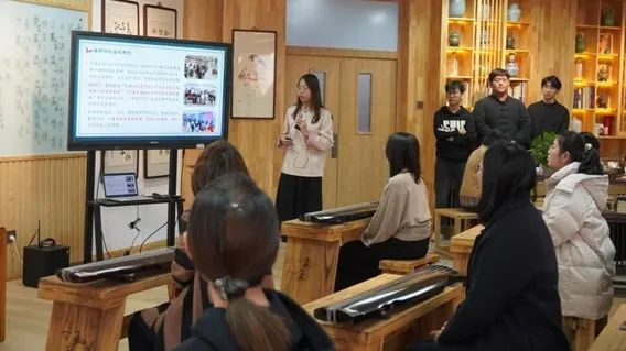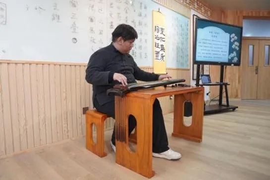 在学校中华优秀传统文化体验中心暨古琴弦歌基地,中华优秀传统文化体验中心暨古琴弦歌基地指导教师晋萌萌老师介绍了该中心在打造“弦歌不辍”中华优秀传统文化育人品牌的具体做法和近几年在传统文化育人方面所取得的成果。煦园琴社同学进行了现场弹唱,并指导与会教师进行了古琴基本指法体验。