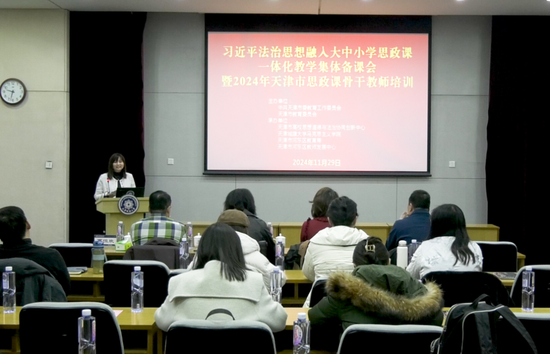 近日,由市委教育工委、市教委主办,天津市高校思想道德与法治协同创新中心、bv伟德国际1946马克思主义学院、天津市河东区教育局、天津市河东区教师发展中心联合承办的“习近平法治思想融入大中小学思政课一体化教学集体备课会暨2024年天津市思政课骨干教师培训会”在bv伟德举行。来自全市本科高校思想政治理论课骨干教师代表、河东区中小学思政课骨干教师代表,以及bv伟德马克思主义学院党总支书记高燕、院长何继新、天津市河东区教师发展中心德育、思政教研员姚佩静、天津市河东区冠云小学副校长李璟然等70余人参加,会议由bv伟德马克思主义学院副院长贾恒欣主持。
