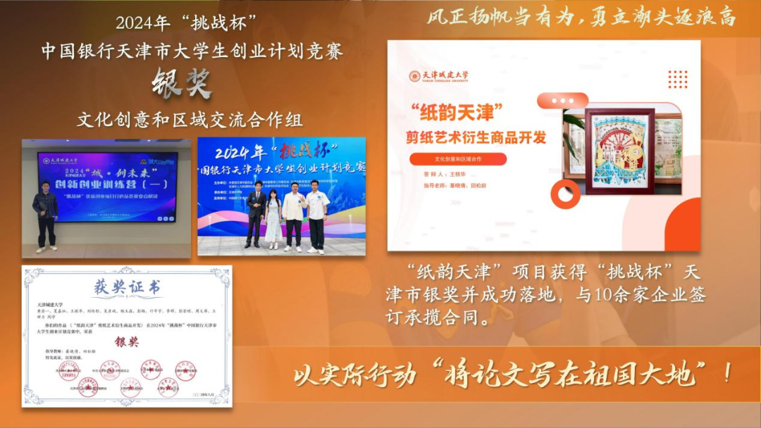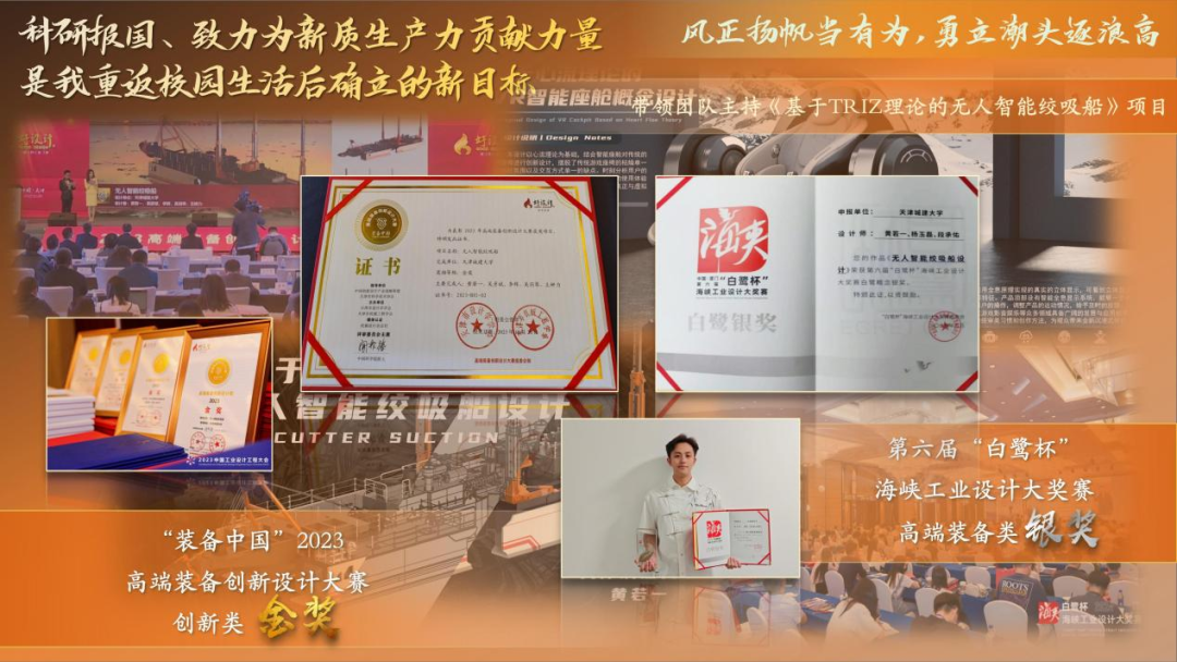 科研报国、致力为新质生产力贡献力量是他重返校园生活后的新目标。为解决国内现有绞吸船非自航的问题,他带领团队主持《基于TRIZ理论的无人智能绞吸船》项目,建立高效的智能模型,得到权威专家认可。基于此,他荣获“装备中国”高端装备设计大赛金奖、“白鹭杯”海峡工业设计大赛银奖,由振动机械领路者闻邦椿院士、99A主战坦克总设计师毛明院士亲自授奖。他的“纸韵天津”项目获得“挑战杯”天津市银奖并成功落地,与10余家企业签订承揽合同,以实际行动“将论文写在祖国大地上”。