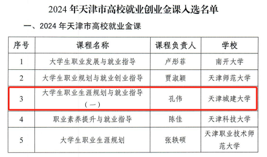 近日,天津市教育两委印发《关于公布2024年天津市高校就业创业金课入选名单的通知》,bv伟德《大学生职业生涯规划与就业指导(一)》课程凭借创新的教学模式、完善的课程体系和显著的教学成效成功入选,是继2023年获批天津市就业金课后的又一门金课,这一荣誉不仅是对bv伟德就业指导工作的高度认可,更是对学校教育教学改革与创新的有力肯定。