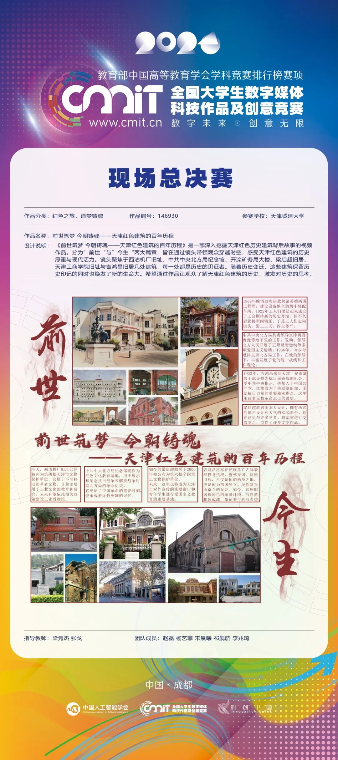 《前世筑梦·今朝铸魂--天津红色建筑的百年历程》是一部深入挖掘天津红色历史建筑背后故事的视频作品。视频分为“前世”与“今生”两大篇章,旨在通过镜头语言带领观众穿越时空,感受天津红色建筑的历史厚重与现代活力,聚焦天津市津浦路西沽机厂旧址、中共中央北方局旧址纪念馆、开滦矿务局大楼、梁启超旧居、工商学院旧址、吉鸿昌旧居等,每一处都是历史的见证者,它们的故事在视频中被娓娓道来,展现了天津红色建筑的历史意义与文化价值。作品在制作过程中注重历史与现代的结合,通过实地拍摄、历史资料的搜集与整理,历史场景重绘,以及模型复原等技术手段,力求为观众呈现立体、生动的天津红色建筑百年历程。