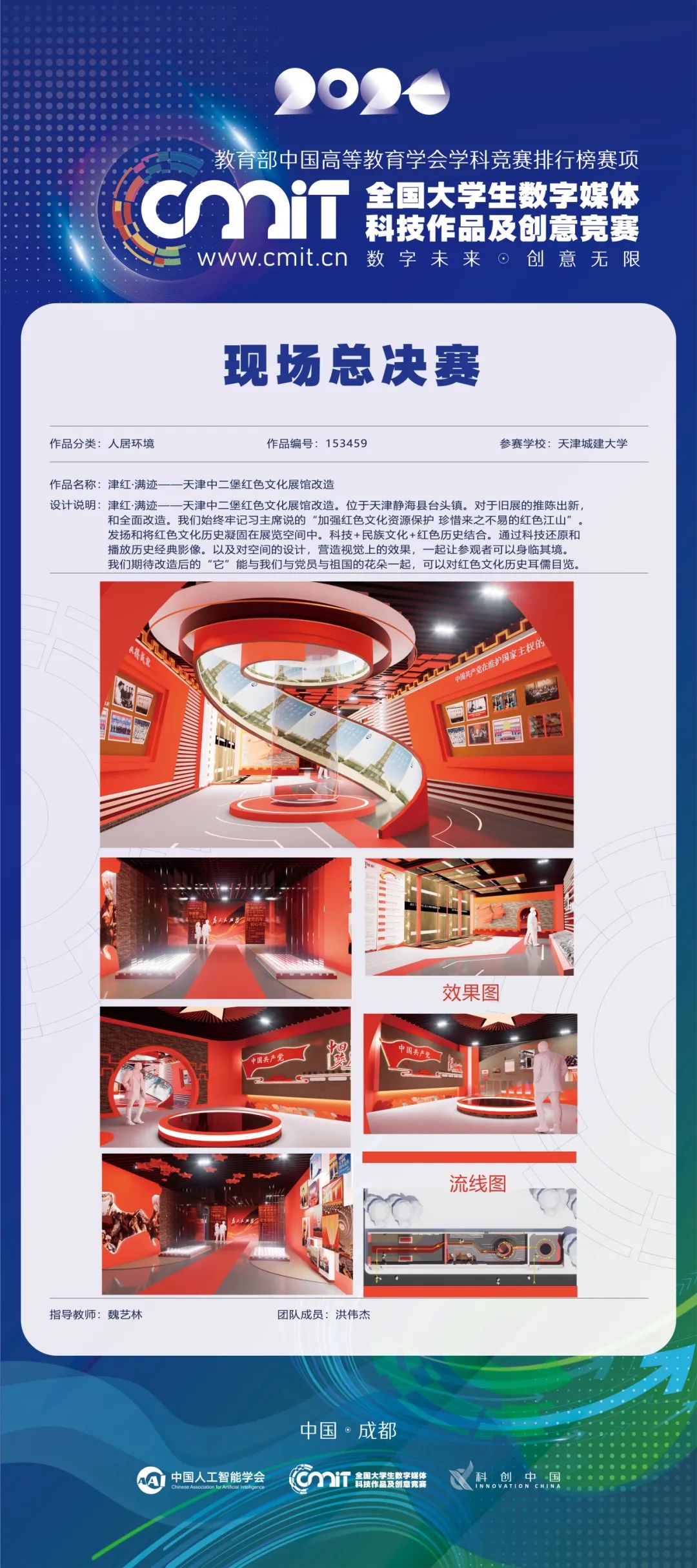 作品《津红·满迹--天津中二堡红色文化展馆改造》定位于天津静海县台头镇,是对于旧展的推陈出新津红·满迹-和全面改造。作品坚持保护好、运用好红色资源,加强革命传统和爱国主义教育的重要理念,将红色文化历史凝固在展览空间中,推动科技+民族文化+红色历史结合,通过科技还原和播放历史经典影像,以及对空间的设计,营造视觉上的效果,让参观者可以身临其境。期待改造后的“它”可以让社会公众深入对红色文化的理解与认同。