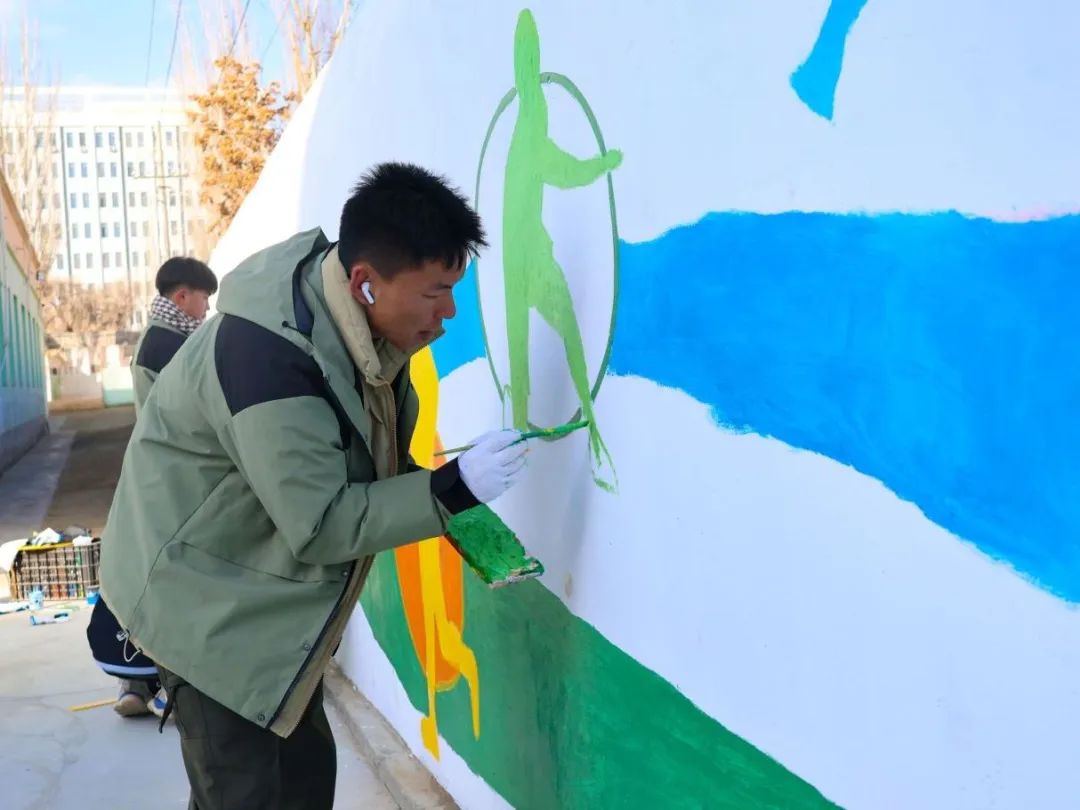 学校赴疆支教团注重将文化润疆、五育润心融入工作日常,他们不仅在课堂上播撒知识的种子,还在校园文化生活的方方面面创设育人情景。墙绘创作过程中,支教团成员团结协作,身体力行,发挥专业特长,彰显劳动风采,并鼓励小学生们积极劳动,亲身实践,展现了积极向上、团结奋进的精神面貌。他们以绘制墙绘的形式充分诠释了德育、智育、体育、美育、劳育的新融合、新发展、新内涵,为支教学校营造了浓厚的爱国主义氛围和学习知识的育人环境,促进当地学生高素质全面发展,为边疆教育事业高质量发展注入新活力。