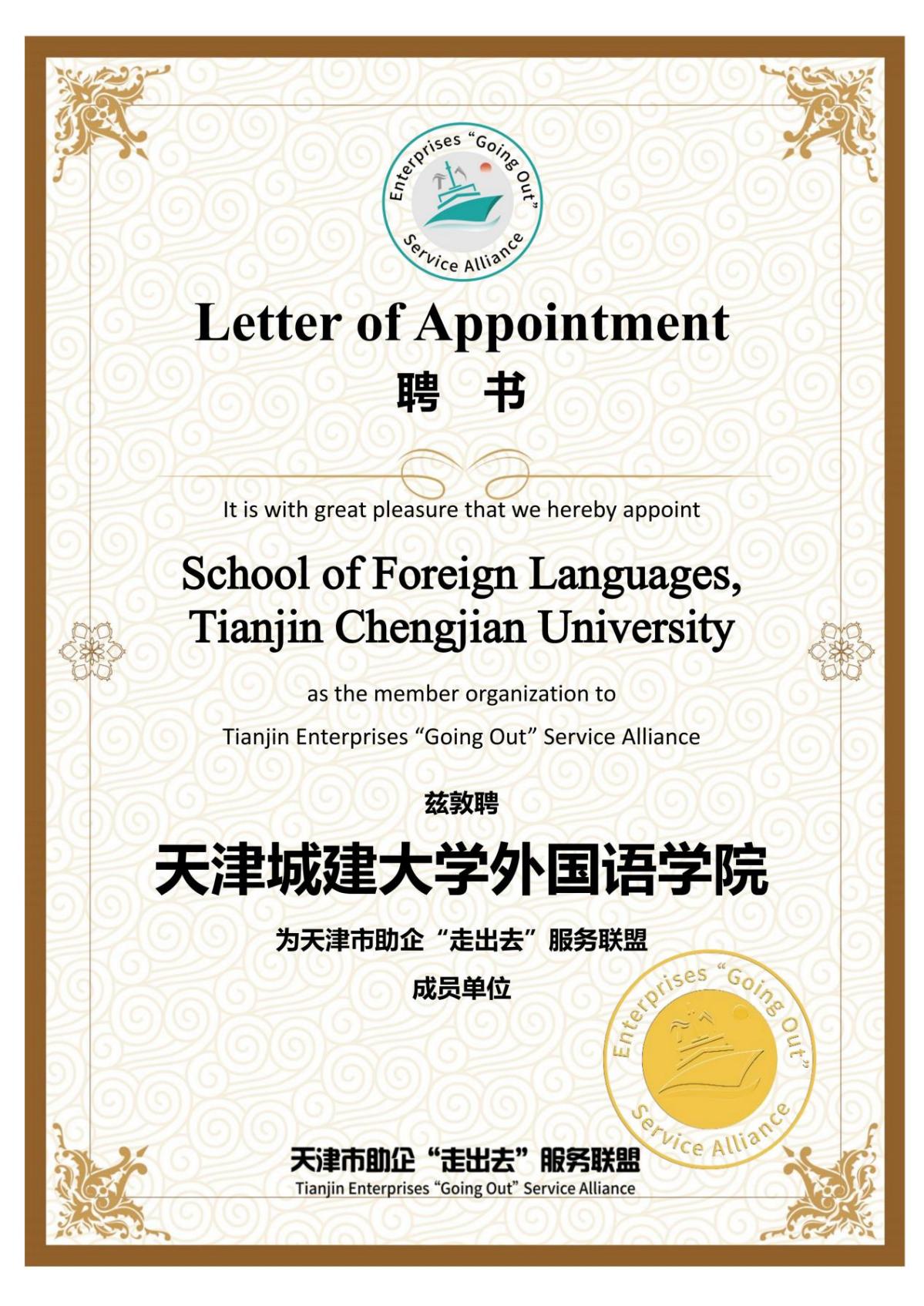 天津市助企“走出去”服务联盟举行了揭牌仪式,服务联盟的指导单位、支持单位、理事长、副理事长单位和成员单位接收聘书。学校外国语学院作为天津市助企“走出去”服务联盟成员单位先行参加了服务联盟第一次会员代表大会,会议审议通过《天津市助企“走出去”服务联盟章程》和服务联盟第一届理事会理事名单。随后,参加了服务联盟第一届理事会第一次会议,会议审议通过理事长、副理事长、秘书长单位及人选,以及第一届理事会工作计划。