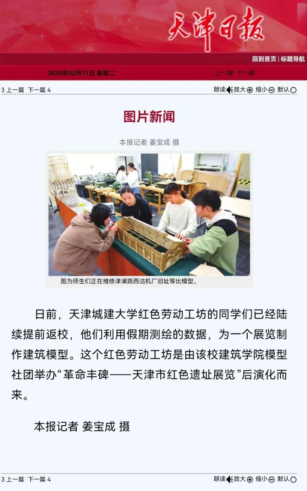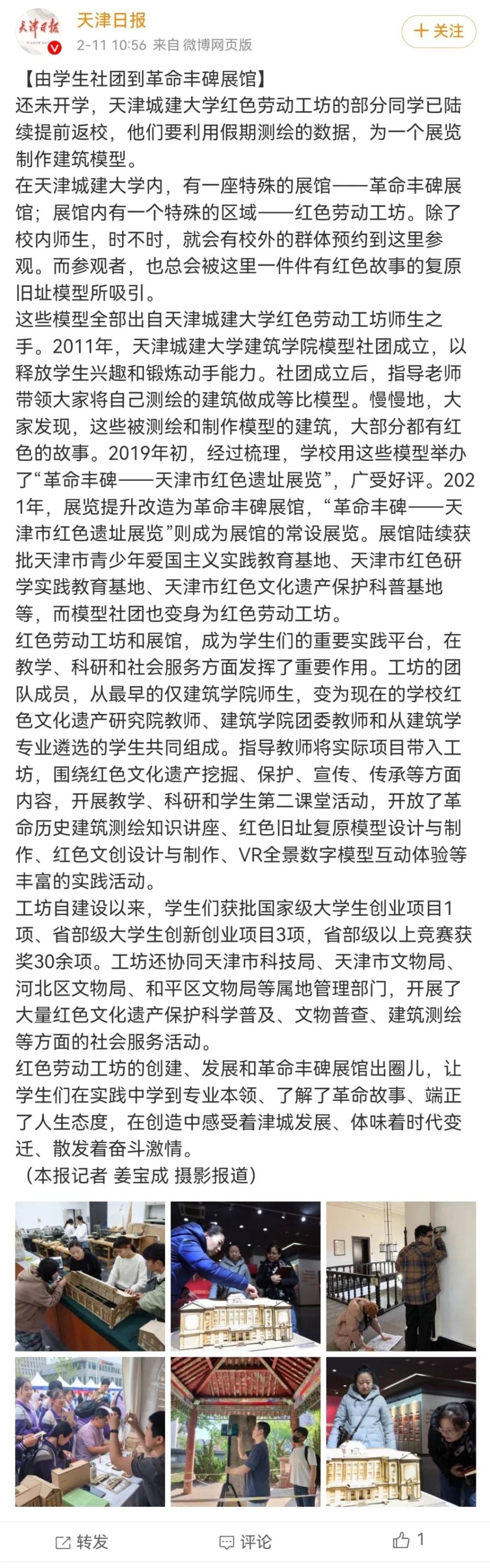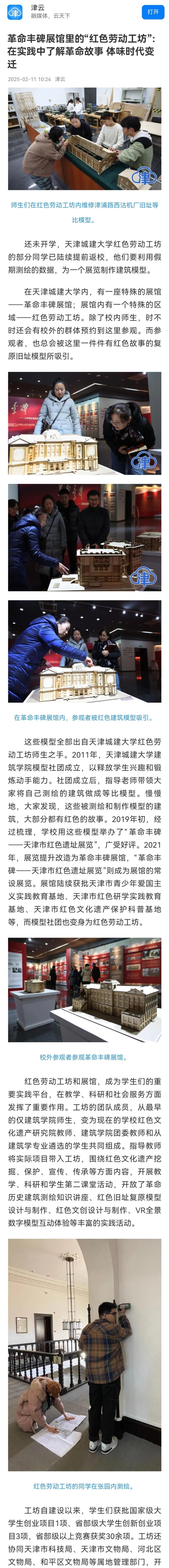 日前,学校红色劳动工坊的同学们已经陆续提前返校,他们利用假期测绘的数据,为一个展览制作建筑模型。学校红色劳动工坊是由建筑学院模型社团举办“革命丰碑——天津市红色遗址展览”后演化而来。工坊自建设以来,获批国家级大学生创业项目1项、省部级大学生创新创业项目3项,省部级以上竞赛获奖30余项。工坊还协同天津市科技局、天津市文物局、河北区文物局、和平区文物局等属地管理部门,开展了大量红色文化遗产保护科学普及、文物普查、建筑测绘等方面的社会服务活动。红色劳动工坊相关活动开展情况受到了天津日报、今晚报、津云等多家媒体宣传报道。