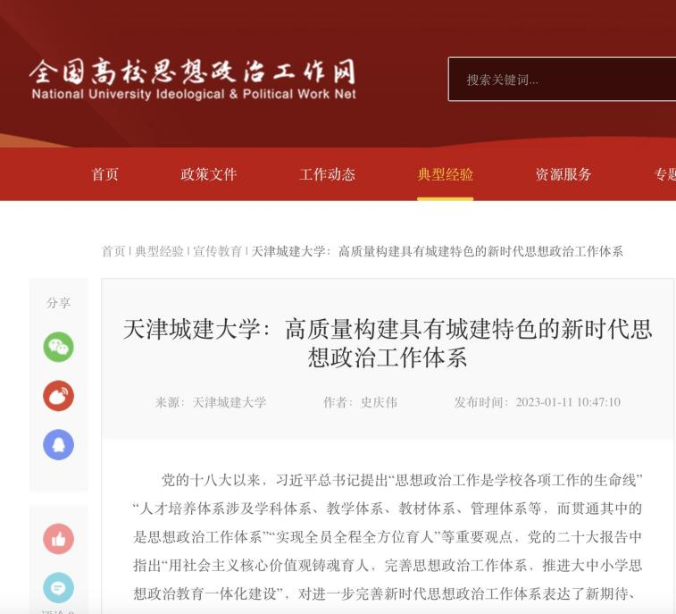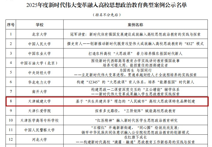 学校持续推进思想政治理论课教学改革创新,获批天津市“大思政课”综合改革示范校培育建设单位,入选天津市高校特色马克思主义学院培育单位。初步构建了“一核·三模块·六维度”“人民城市”思政课实践教学育人体系,持续打造“知识传授+历史素养+时代担当+价值引领”的特色思政课实践教学品牌,不断完善智慧马院教育平台,马院“人工智能+思政课”全链条一体化智慧教学项目于2024年获批天津市首批“人工智能+高等教育”典型应用场景。依托革命丰碑、中华优秀传统文化体验中心暨古琴弦歌基地、“善学善建”城建特色中小学劳动教育实践基地等,协同推进学校思政课程与课程思政,推动大中小学思政课一体化建设,引导学生在“小我”融入“大我”的过程中,主动服务国家重大战略,服务地区经济社会发展。