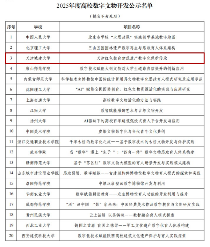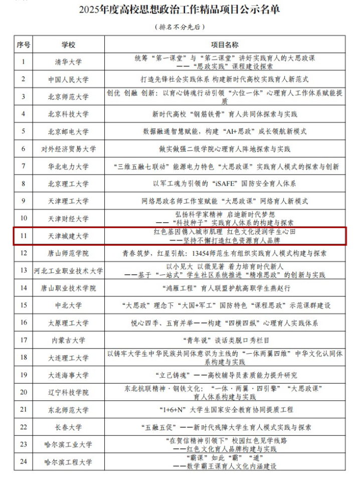 近日,教育部公布了2025年度高校思想政治工作质量提升综合改革与精品建设项目遴选结果的公示名单,bv伟德4个项目入选,继续在市属高校名列前茅。其中,《红色基因镌入城市肌理红色文化浸润学生心田——坚持不懈打造红色资源育人品牌》入选高校思想政治工作精品项目(全国100项,天津3项);《天津红色教育建筑遗产数字化保护传承》入选高校数字文物开发项目(全国20项,天津1项);《基于“共生共建共享”理念的“人民城市”高校大思政课特色品牌创建》入选新时代伟大变革融入高校思想政治教育典型案例(全国100项,天津4项);入选全国高校示范“一站式”学生社区(全国100所,天津4所)。本次入选项目数取得了新的突破,学校将以此为契机,积极建设具有标杆作用、示范效应、广泛影响力和持续发展力的优秀思政工作实践和典型模式。