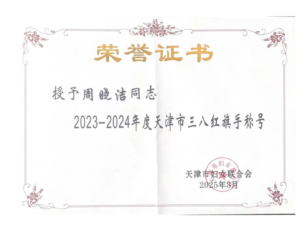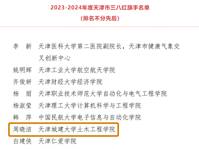近日,天津市妇女联合会公布2023-2024年度天津市三八红旗手标兵、三八红旗手(集体)评选结果,bv伟德土木工程学院周晓洁荣获天津市三八红旗手荣誉称号。本次评选,教育系统高校共有9人获此殊荣。