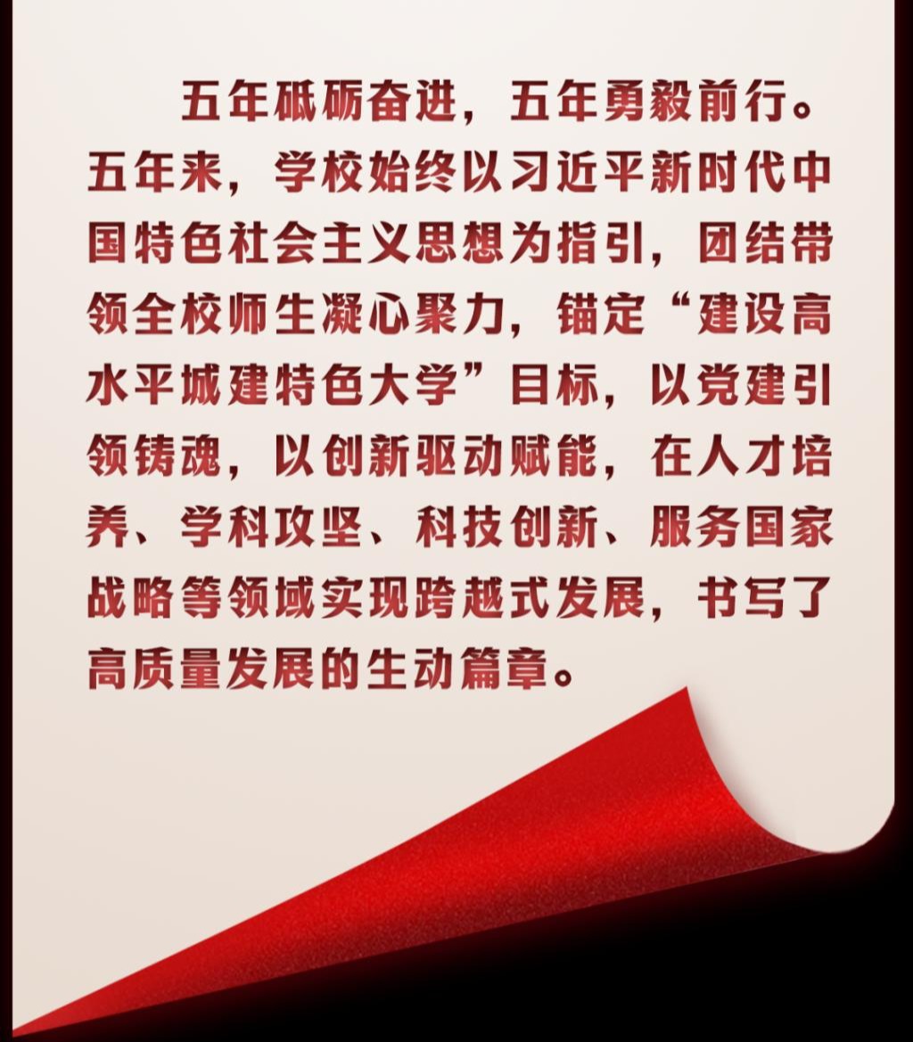 五载风雨谱华章,五年砥砺奋进再出发。穿过岁月,走过荆棘,天城大人始终牢记立德树人的初心使命,砥砺前行、笃行不怠,用热血与汗水交出了亮眼的答卷。站在新起点,奋进的号角已然吹响,崭新的征程已然开启,天城大人将以更加昂扬的奋斗姿态、更加饱满的干事热情、更加扎实的工作作风接续奋斗,不断推进学校事业高质量内涵式发展,加快建设国内一流、国际上有影响的高水平城建特色大学,以优异的成绩和昂扬的面貌为建设教育强国、教育强市贡献天城大力量!