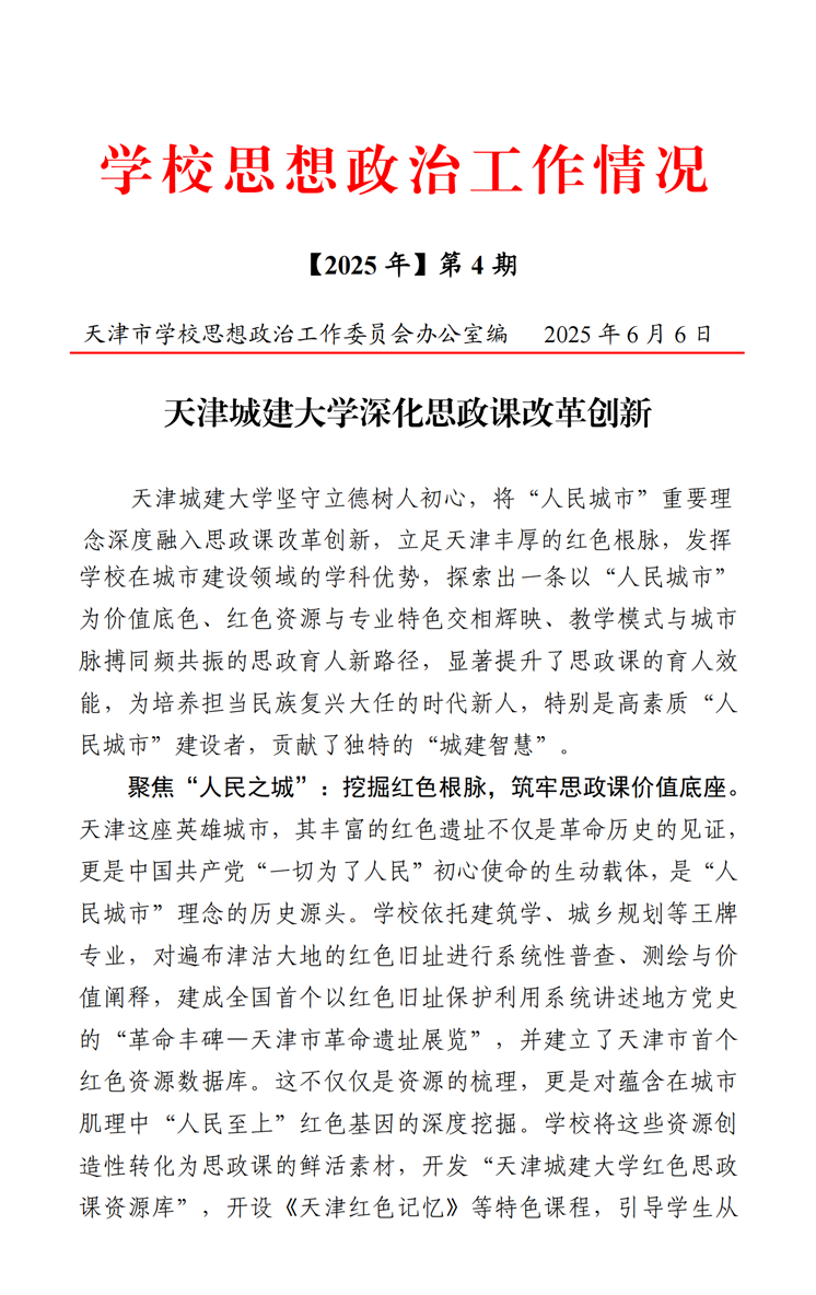 成立“1+17”立体化课程思政矩阵——设立校级教学研究中心,联动17个教学单位分中心,选树9个标杆示范中心,实现课程思政全覆盖。建筑工程系获评首批天津市级普通高校优秀基层教学组织。累计建成教育部及市级示范课程25门、市级优秀教材4种及故事思政微课大赛课程思政组特等奖1项,斩获教育部、市级高校思政工作精品项目24项,领跑全市高校。首创“以红色建筑讲述地方党史”新模式,依托革命丰碑展馆、红色文化遗产研究院,将百年建筑转化为沉浸式党史课堂,获批天津市红色文化遗产保护科普基地等5个基地。