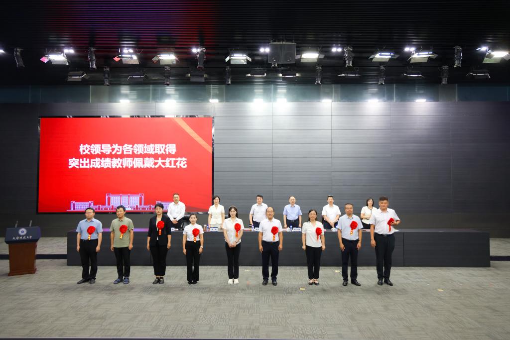 致敬师者担当,礼赞育人初心。校领导为荣获校级优秀教师和优秀教育工作者称号的80名教师颁发荣誉证书,为国家级人才计划青年项目入选者程星磊、天津市三八红旗手周晓洁等在思想政治、教学科研、指导学生竞赛、社会实践等各项工作中取得突出成绩的教师佩戴大红花,充分肯定他们敬业奉献、持之以恒的坚持与付出。