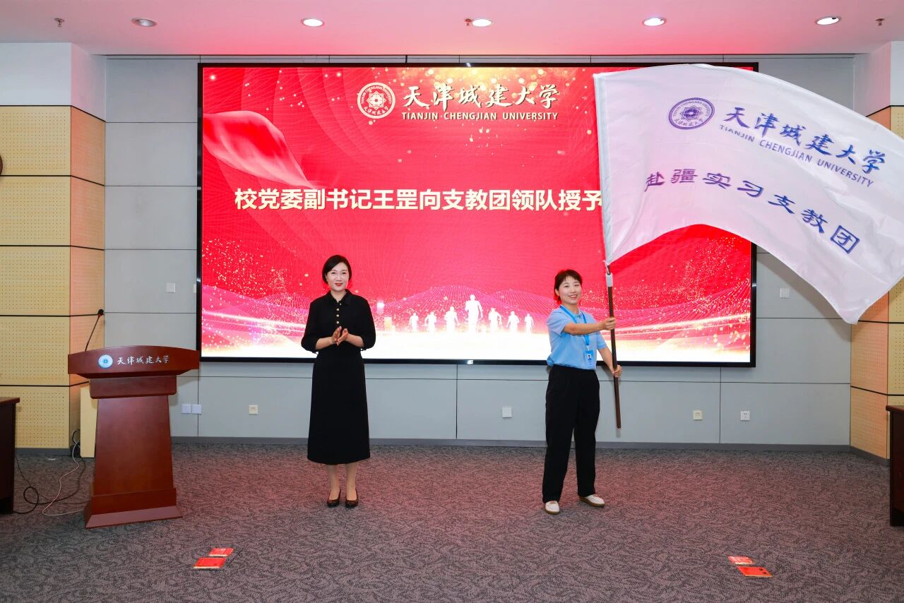 王罡向bv伟德国际1946赴新疆和田地区实习支教团授团旗,支教团领队、土木工程学院党委副书记陈静媛接过团旗,并带领全体支教团师生庄严宣誓:“高举旗帜,甘于奉献;牢记使命,勇挑重担;重德重能,善学善建;虚心学习,躬身实践;献身边疆,圆梦和田;永葆家国情怀,谱写支教新篇。”一声声铿锵誓言在会场回荡,充分展现了天城大青年响应国家号召、投身边疆教育事业的坚定决心。