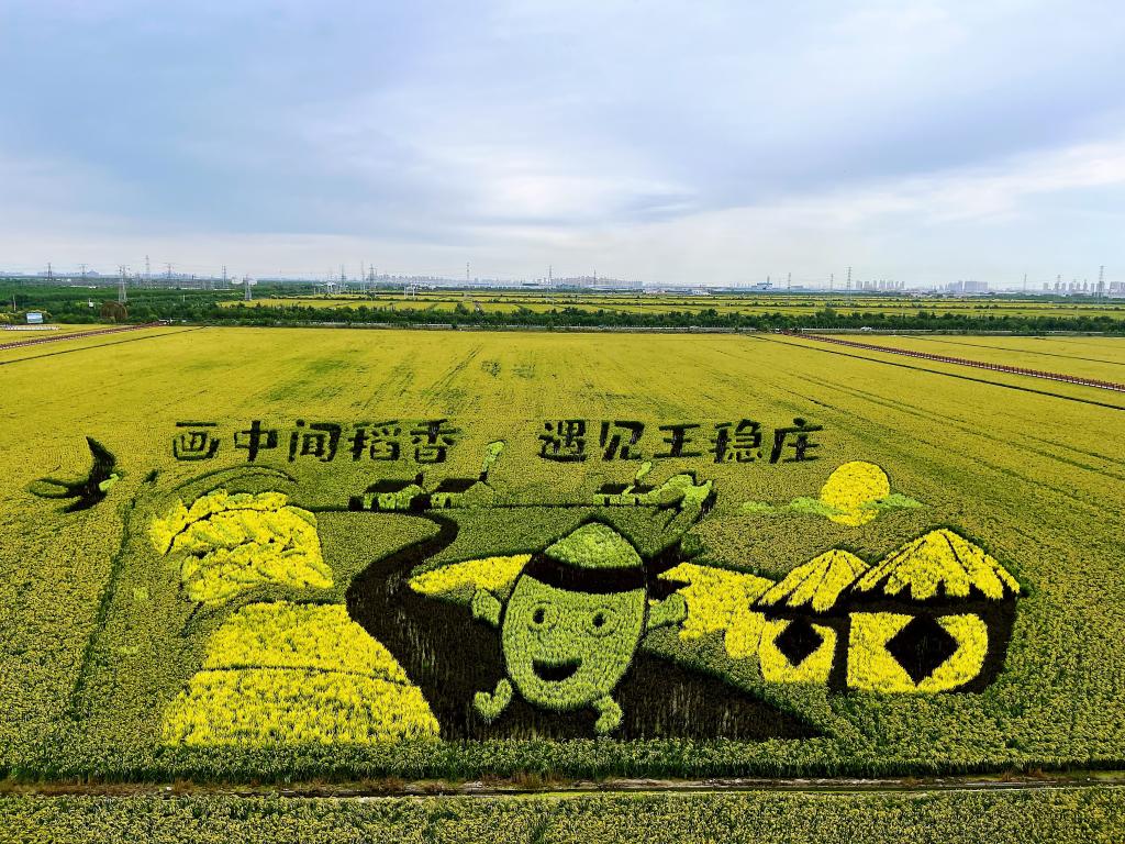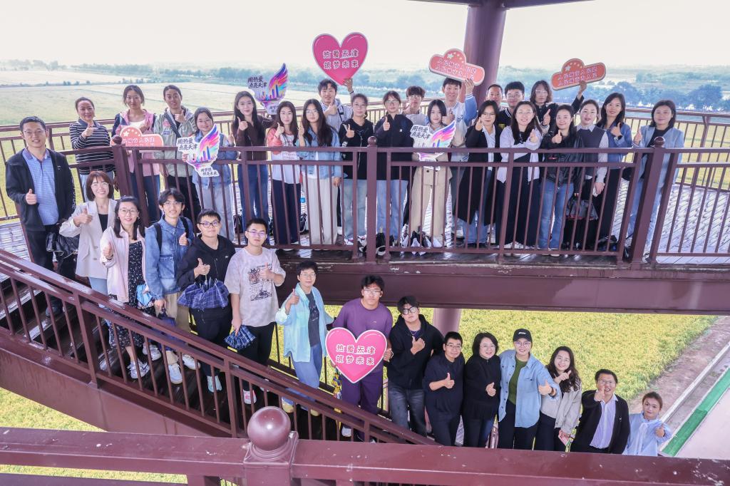 随后,师生们一行在工作人员的引导下登上丰收塔俯瞰稻田画。极目远眺,由不同色彩的水稻“绘制”而成的巨幅画卷在田间震撼铺展,色彩错落间生动勾勒出乡村振兴的美好图景。