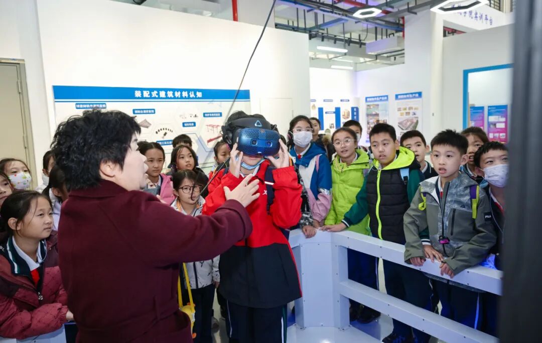 “同学们看,这些预制墙板就像‘乐高积木’,在工厂精准生产后,运到工地就能快速组装!”基地杜老师一边在沙盘上演示装配式构件的生产流程,一边结合实例讲解。“过去工人师傅手工砌筑,不仅辛苦还容易有误差,而装配式建筑用科技代替人工,既保证了质量,又降低了安全风险——这就是工匠精神里的精益求精。”孩子们听得入神,纷纷戴上VR设备体验虚拟建造。当看到自己亲手搭建的楼房在屏幕上拔地而起时,他们兴奋地互相分享:“原来盖房子可以这么智能。”