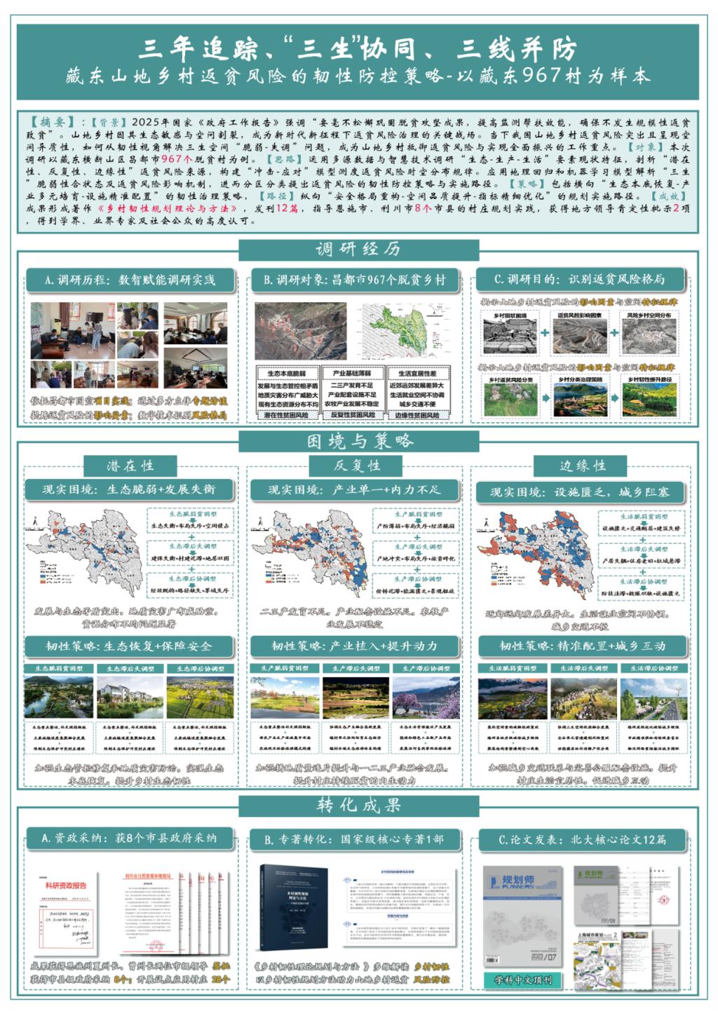 2025年国家《政府工作报告》提出要巩固脱贫成果、防止规模性返贫。山地乡村生态与区位脆弱,返贫风险突出且存在空间差异。研究以西藏昌都967个脱贫村为例,运用多源数据与智慧技术,分析“三生”空间特征及返贫风险来源,构建“冲击-应对”模型测度风险分布,并通过地理加权回归与机器学习解析影响机制。研究提出横向“生态-产业-设施”系统治理与纵向“安全-品质-指标”规划路径相结合的韧性防控策略。成果形成专著1部、论文12篇,指导多地规划实践,获多项奖项与批示,受到广泛认可。