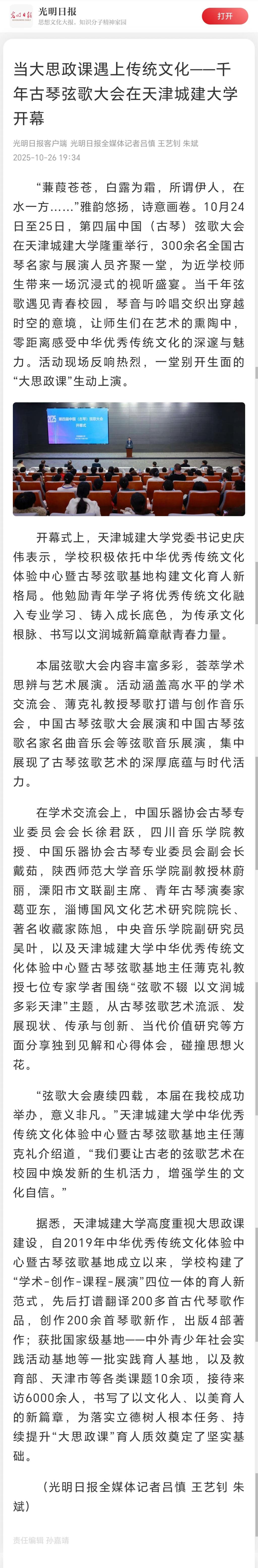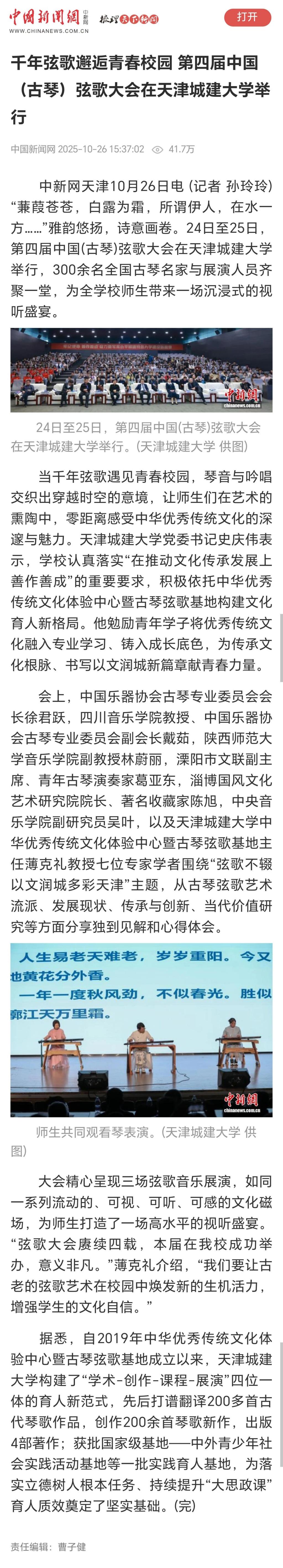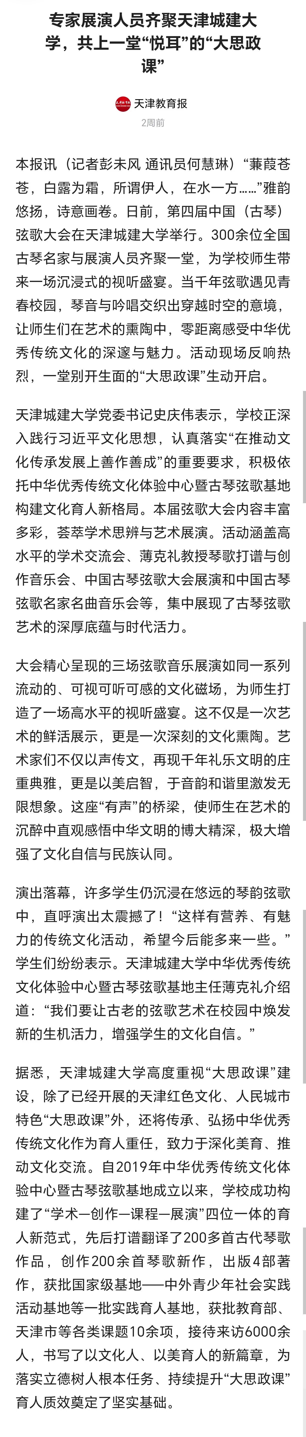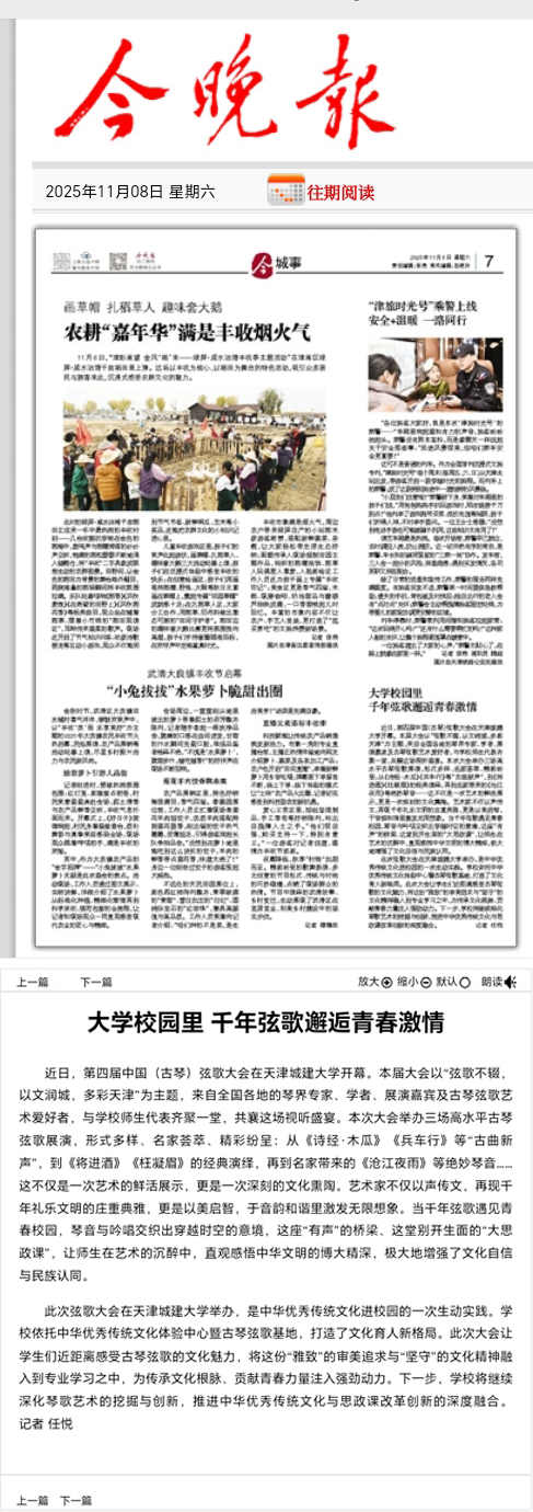 10月24日-25日,第四届中国(古琴)弦歌大会在bv伟德隆重召开。全国古琴名家与展演人员齐聚一堂,为学校师生带来一场沉浸式的视听盛宴。琴音与吟唱交织出穿越时空的意境,让师生们在艺术的熏陶中,零距离感受中华优秀传统文化的深邃与魅力。活动现场反响热烈,受到了人民日报、光明日报、中国日报、中国教育报、天津教育报、中国新闻网、津门网络大思政等多家媒体宣传报道。