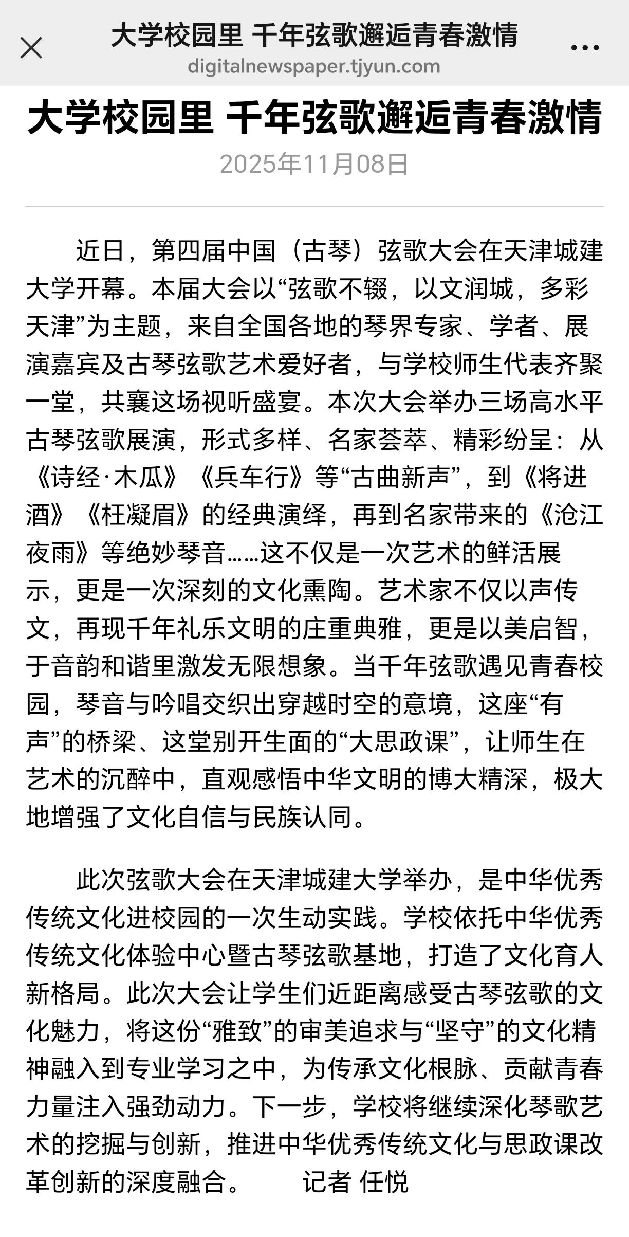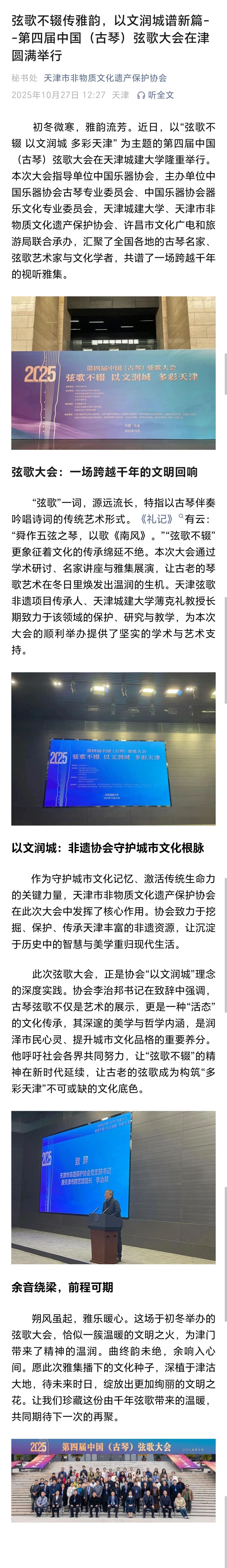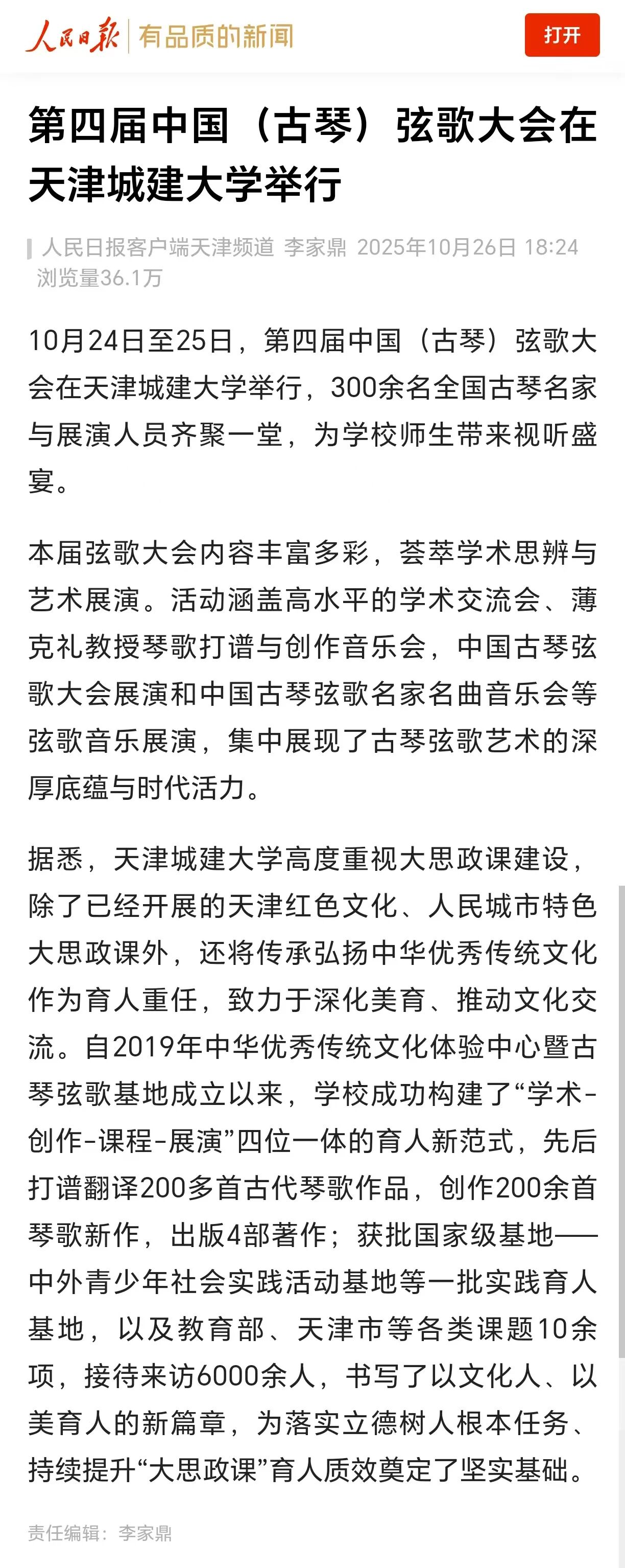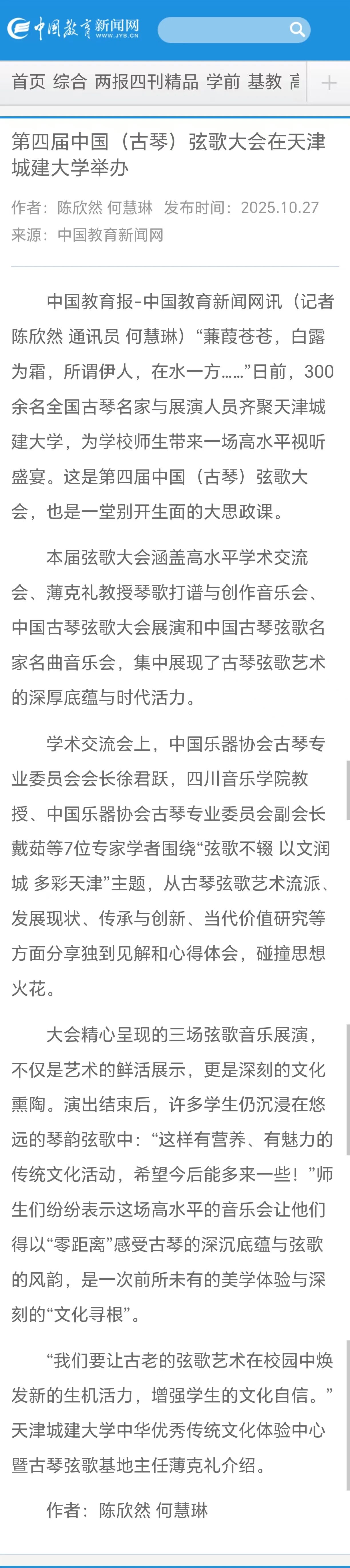 10月24日-25日,第四届中国(古琴)弦歌大会在bv伟德隆重召开。全国古琴名家与展演人员齐聚一堂,为学校师生带来一场沉浸式的视听盛宴。琴音与吟唱交织出穿越时空的意境,让师生们在艺术的熏陶中,零距离感受中华优秀传统文化的深邃与魅力。活动现场反响热烈,受到了人民日报、光明日报、中国日报、中国教育报、天津教育报、中国新闻网、津门网络大思政等多家媒体宣传报道。
