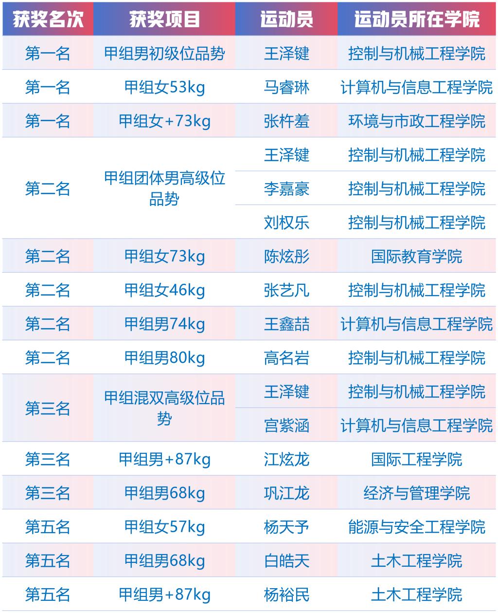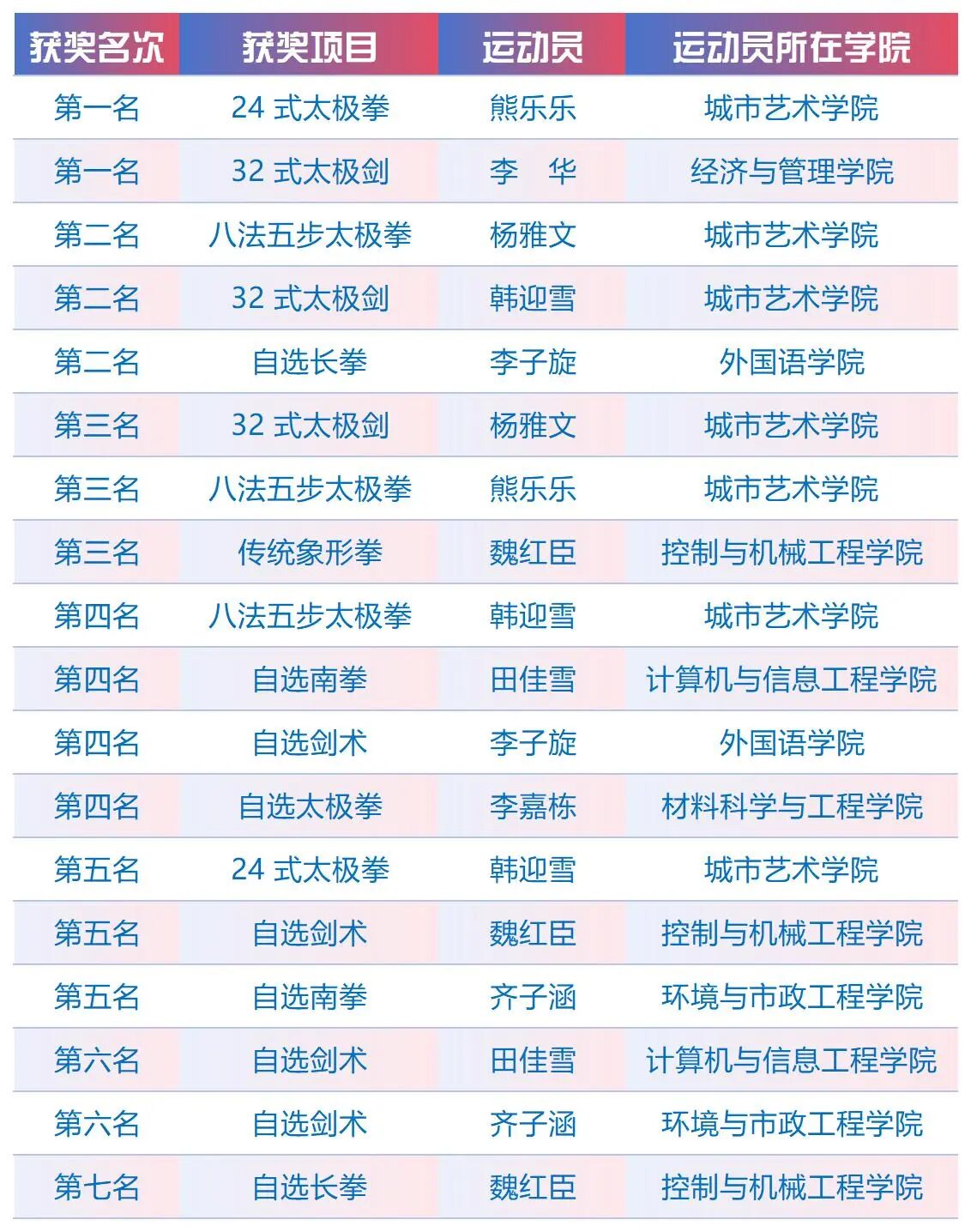 武术队由体育部主任王建华担任领队,邓中永、刘阳、宋骞担任教练,共选派出来自多个学院的9名高水平运动员参赛。跆拳道队则由刘丽、李正、王晓乐三位老师指导,共选派出来自多个学院的17名运动员出战。