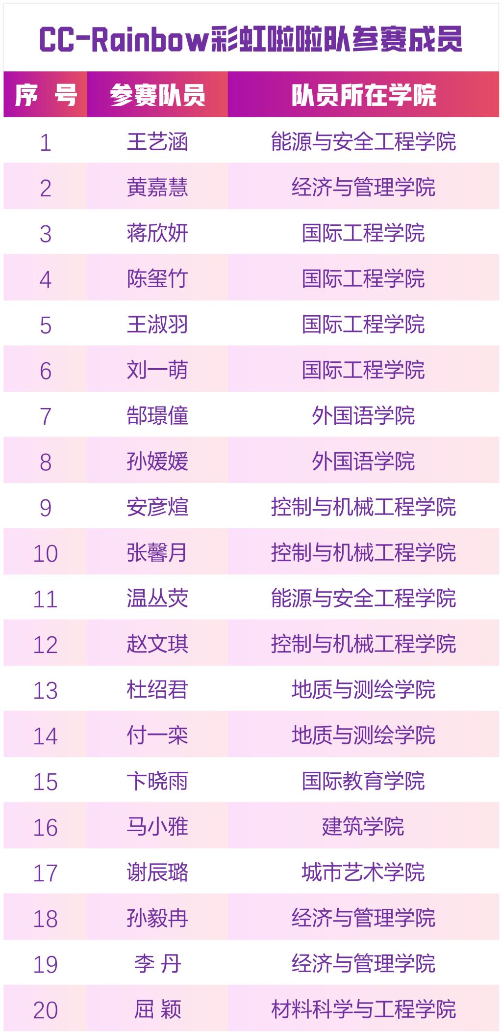 CC-rainbow彩虹啦啦队由王建华领队,阎静任教练,派出20名队员分别参加集体自由舞蹈和双人街舞两个项目。