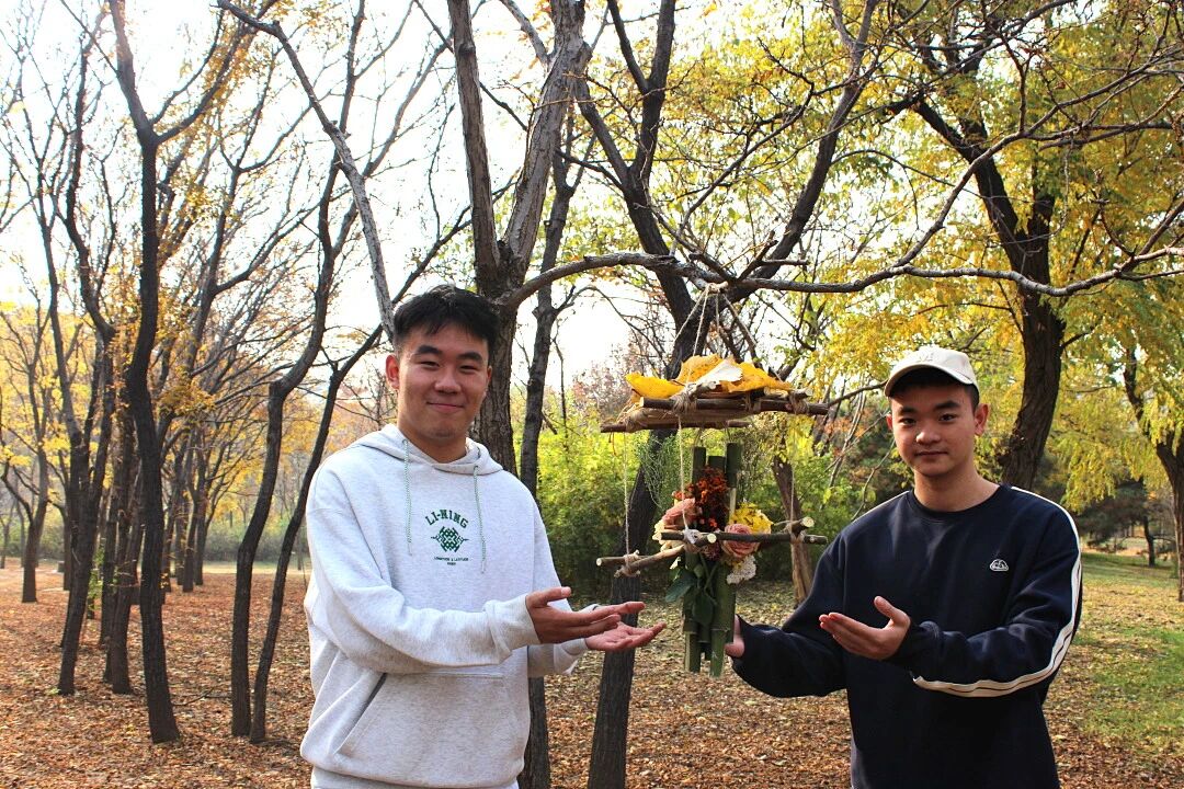 为了打破这层“隔膜”,由风景园林系副教授霍艳虹、教学主任魏冬雪、教师李源、刘一勍组成的教学团队精心设计了本次实践主题,以“风景中的时间与自然语言”为核心命题,要求学生在不破坏校园环境、不影响空间使用的前提下,利用校园内自然脱落的树枝、落叶、松果、土石等环保或废弃材料,在选定场地构建一组能够与校园环境对话的艺术装置。这不仅是一次设计实践,更是一场“自然材料的疗愈建构”启蒙。学生必须直面材料的韧性、重量与平衡问题,在与自然的“较劲”与“妥协”中,找回专注,感受建构逻辑与自然肌理。