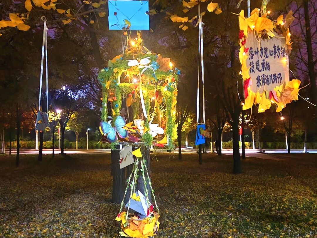 最后的冲刺阶段,大家几乎是“长”在了校园里。为了赶在汇报前完成,有的组员趴在冰冷的草地上调整石子的摆放位置,有的用剪刀修剪自然书签的轮廓。当最后一根绳结系好,当夕阳的余晖穿过装置投下斑驳光影,所有的疲惫都化作了眼底的光芒。