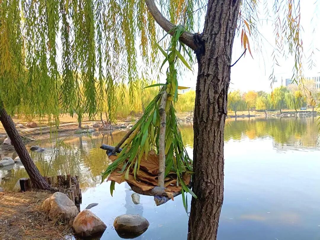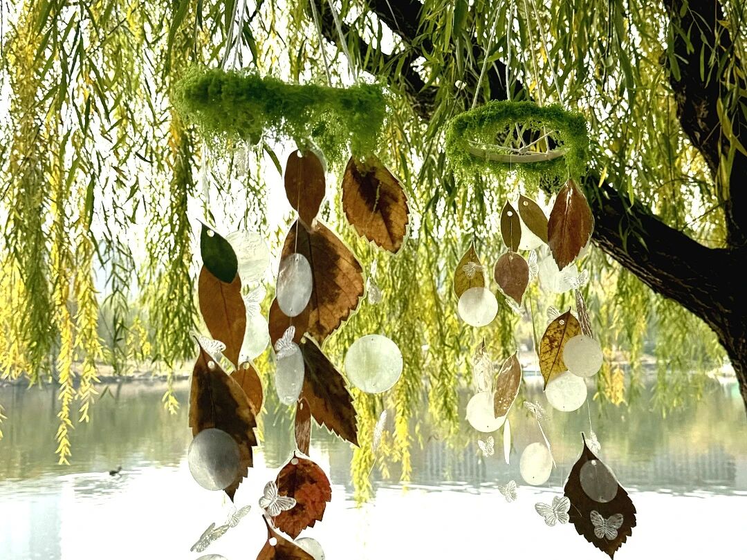 最终,一场流动的“大地艺术展”在校园内悄然绽放。与以往在教室内播放PPT的结课方式不同,这次的最终汇报,是一场沉浸式的“游园会”。师生们组成的评审团穿梭于林间、湖畔、草坪,聆听每一组作品背后的故事。“请大家走到这边来,这是我们组的作品……”每一个装置前,就是这组同学的临时讲台。没有冰冷的屏幕,只有真实的触感。同学们现场演示装置与环境的互动:看风吹过芦苇编织的网,看阳光穿过树叶洒下的斑驳光影,听小石子滚落的声音。其他同学和老师们现场体验、触摸、感受。这种“在场”的汇报方式,让大家真切地体会到了设计如何介入场地,艺术如何疗愈身心。