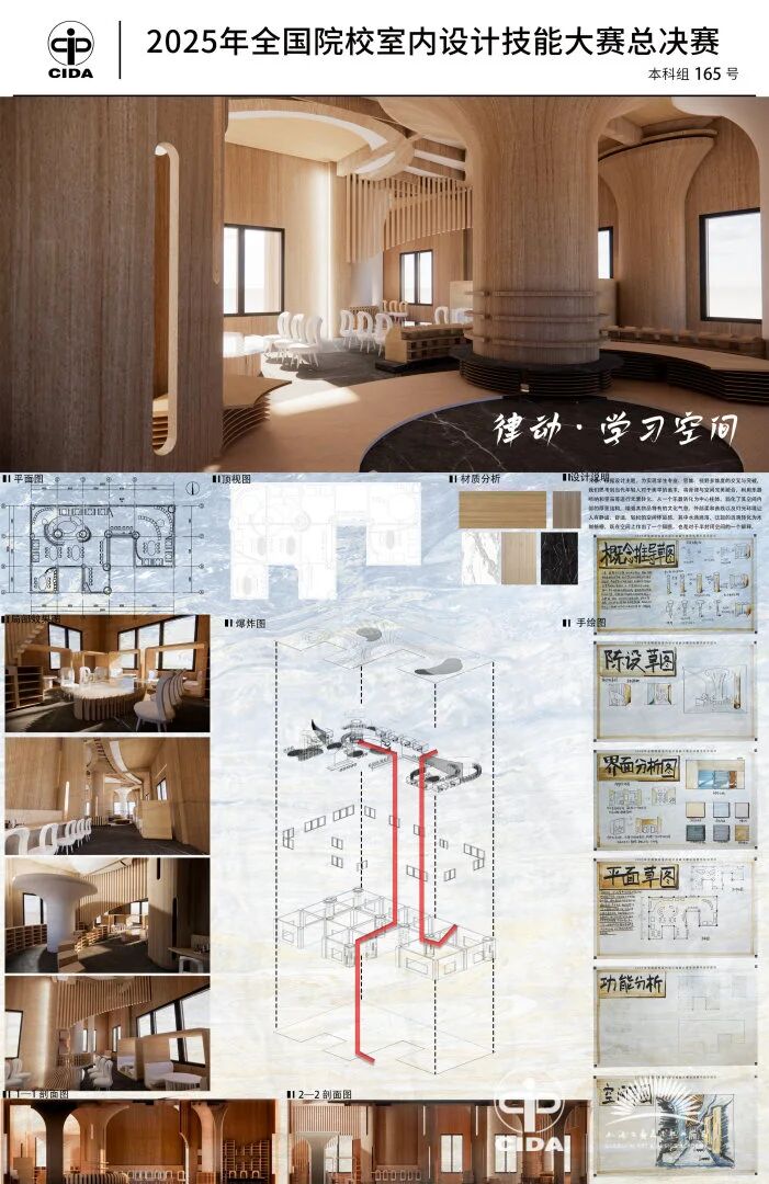 本次比赛也为参赛学子提供了践行真知、深化理念的成长平台。周锦如同学表示,通过参赛,自己的手绘与软件实操能力得到显著提升,设计思维与创意表达也获得了扎实锻炼,为未来就业积累了宝贵经验。李晨晓同学则认为,比赛让他对室内设计有了更深的理解:“设计不应只是形式的堆砌,更要始终坚持‘为人设计’,将人性化思考融入空间规划、功能布局与细节处理之中。”