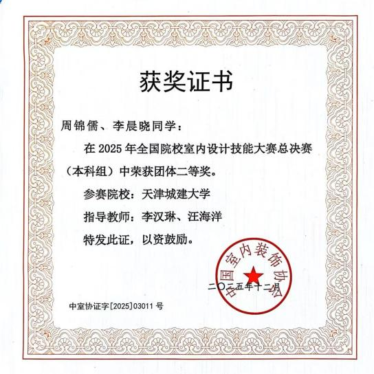 近日,2025年全国院校室内设计技能大赛国赛总决赛在上海落下帷幕。bv伟德建筑学院学生周锦儒、李晨晓在指导教师李汉琳、汪海洋的指导下,凭借扎实的专业功底与出色的现场发挥,荣获全国总决赛二等奖。