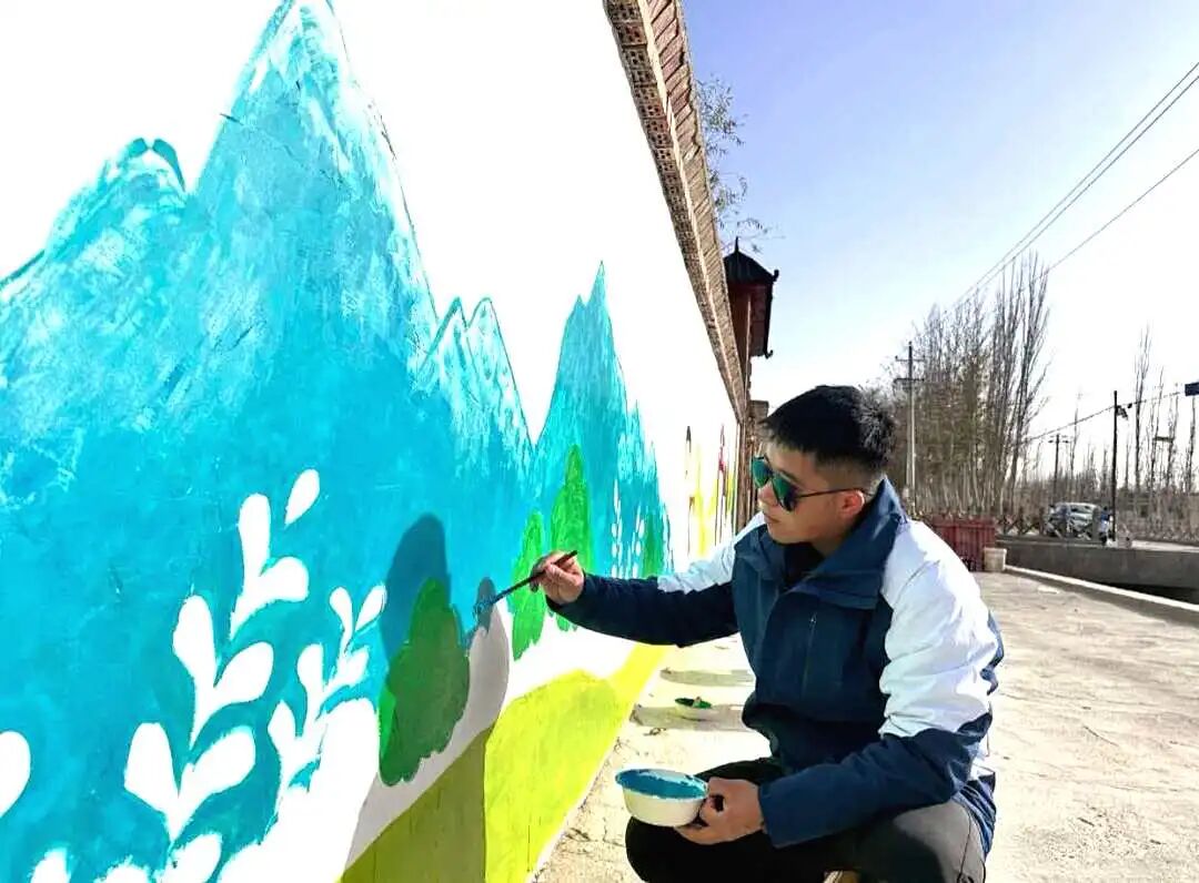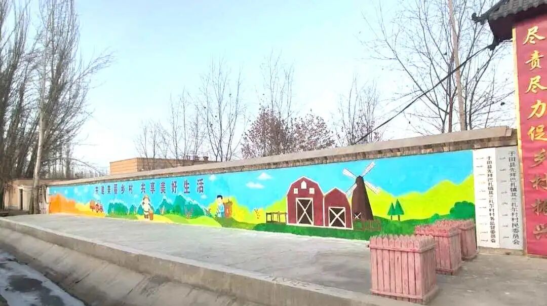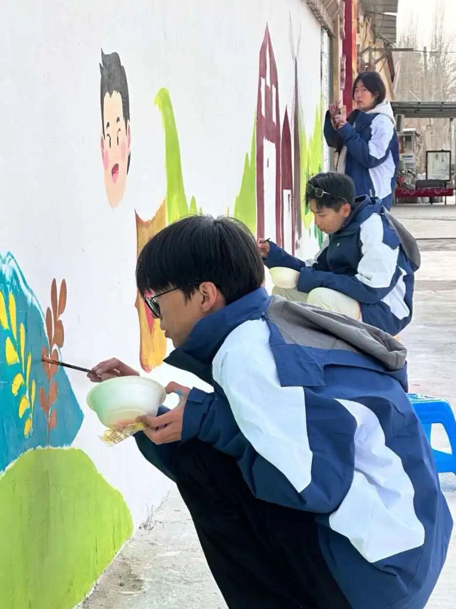历时四周,我们利用周末休息时间,来到村里,绘制了一幅长达35米的乡村画卷。同学们调绘着最鲜艳的色彩,笔下有金黄的麦浪、巍峨的昆仑、秋收的农民,还有象征吉祥的纹样。这不仅仅是墙绘,更是我们与老乡们共同构思、一起期盼的美丽乡村愿景。当最后一笔画完,一位维吾尔族老爷爷竖起大拇指,用不太流利的普通话说着“天津,亚克西!”时,我们忽然懂得,最美的作品,是情感交融的果实。
