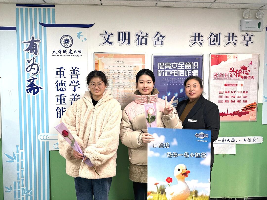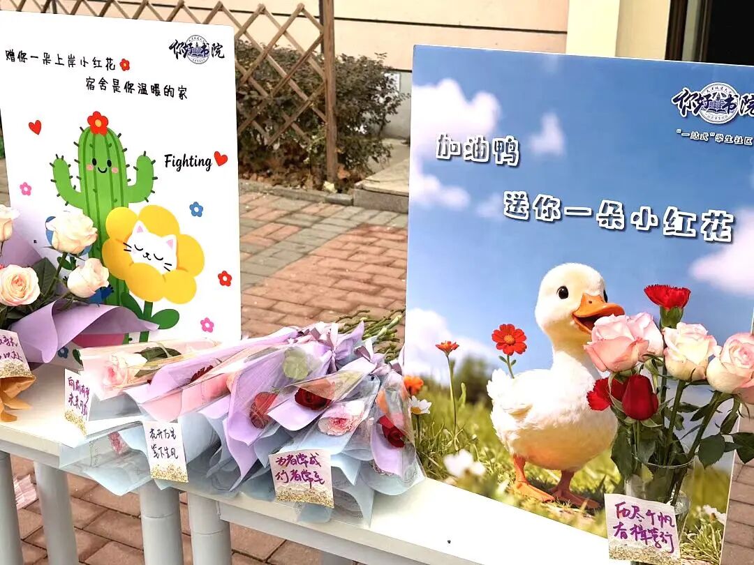 “一站式”学生社区把温暖送到“家”门口。开展“赠你一朵上岸小红花,宿舍是你温暖的家”暖心祝福活动,为正在冲刺备考的莘莘学子送去关怀与鼓励。学生社区相关负责教师、宿管阿姨、叔叔们化身祝福使者,将一支支饱含祝福的“上岸”小红花亲手送到备考的学子手中。“孩子,放平心态,你一定行!”“加油,这几天吃好睡好,‘家’里都支持你!”一句句朴实真挚的叮咛,一声声熟悉亲切的鼓励,充满温暖。特别设置的“惊喜上门”环节,更让正在伏案疾书的学子收获意外感动,一份来自“社区大家庭”的专属关怀,让备考之路暖意融融。