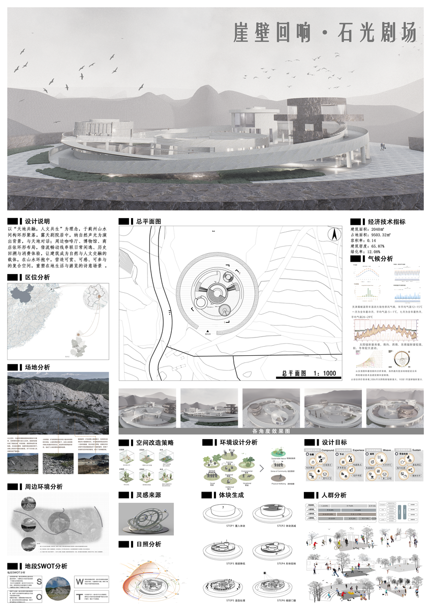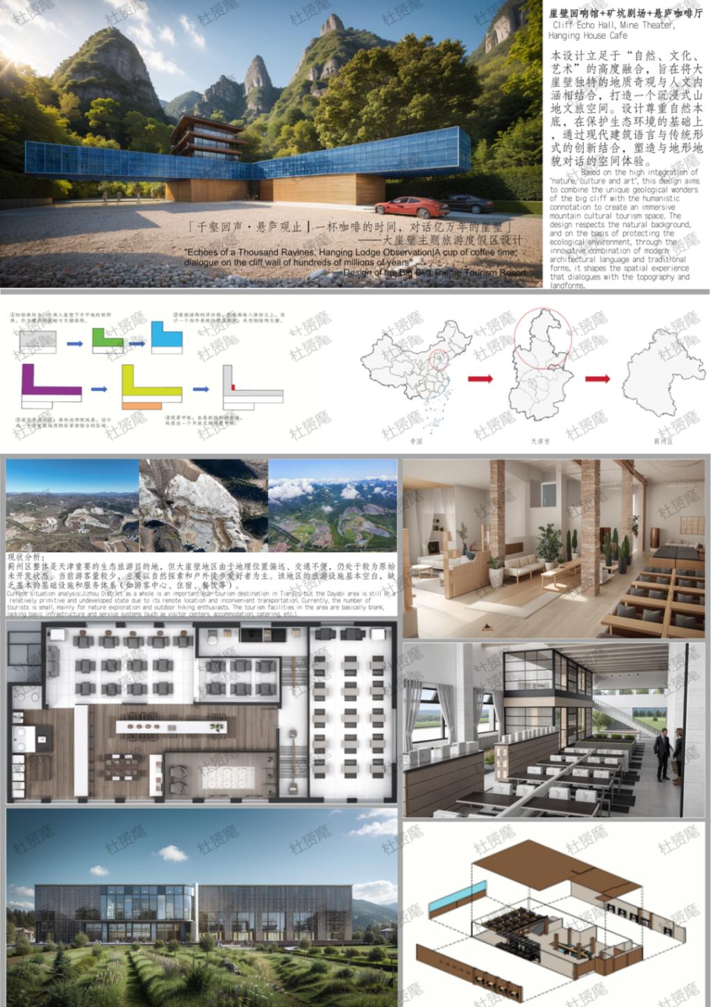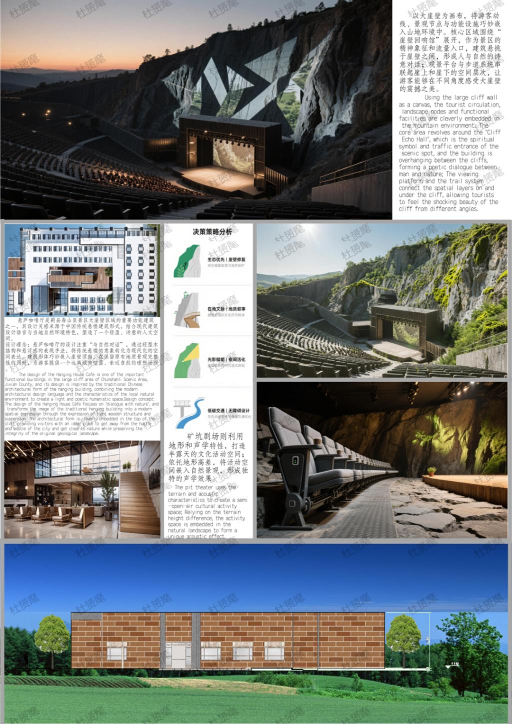 该设计以“自然、人文、艺术”为核心,依托大崖壁景观与生态,打造沉浸式文旅空间。设计融合现代建筑结构与传统形式,将自然奇观化为人文场域,实现人与自然的对话。核心建筑“崖壁回响馆”悬挑崖壁,轻盈融于自然,兼具生态保护与精神象征;矿坑剧场借地形与声学,形成半露天文化空间;悬庐咖啡厅源自传统悬楼,以轻型木结构悬于崖壁顶,供游客赏山。设计秉持生态友好,借岩壁艺术与沉浸式空间强化文化,让到访者感受自然魅力与共生之美。