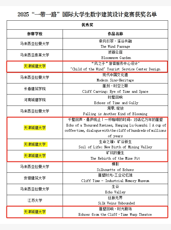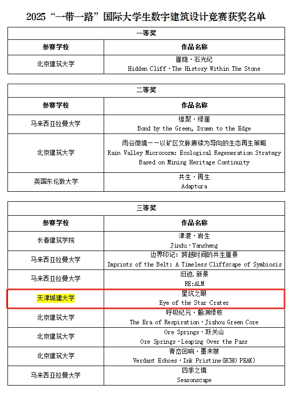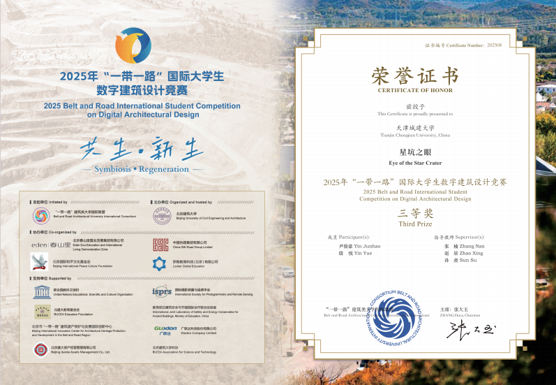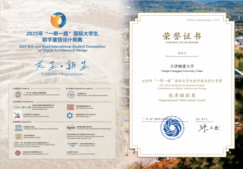 近日,由“一带一路”建筑类大学国际联盟发起、北京建筑大学主办的2025“一带一路”国际大学生数字建筑设计竞赛公布获奖名单。bv伟德推荐的六项参赛作品全部获奖,分别荣获三等奖1项, 优秀奖5项,13名教师荣获“优秀指导教师”称号,bv伟德连续五年获评优秀组织奖。