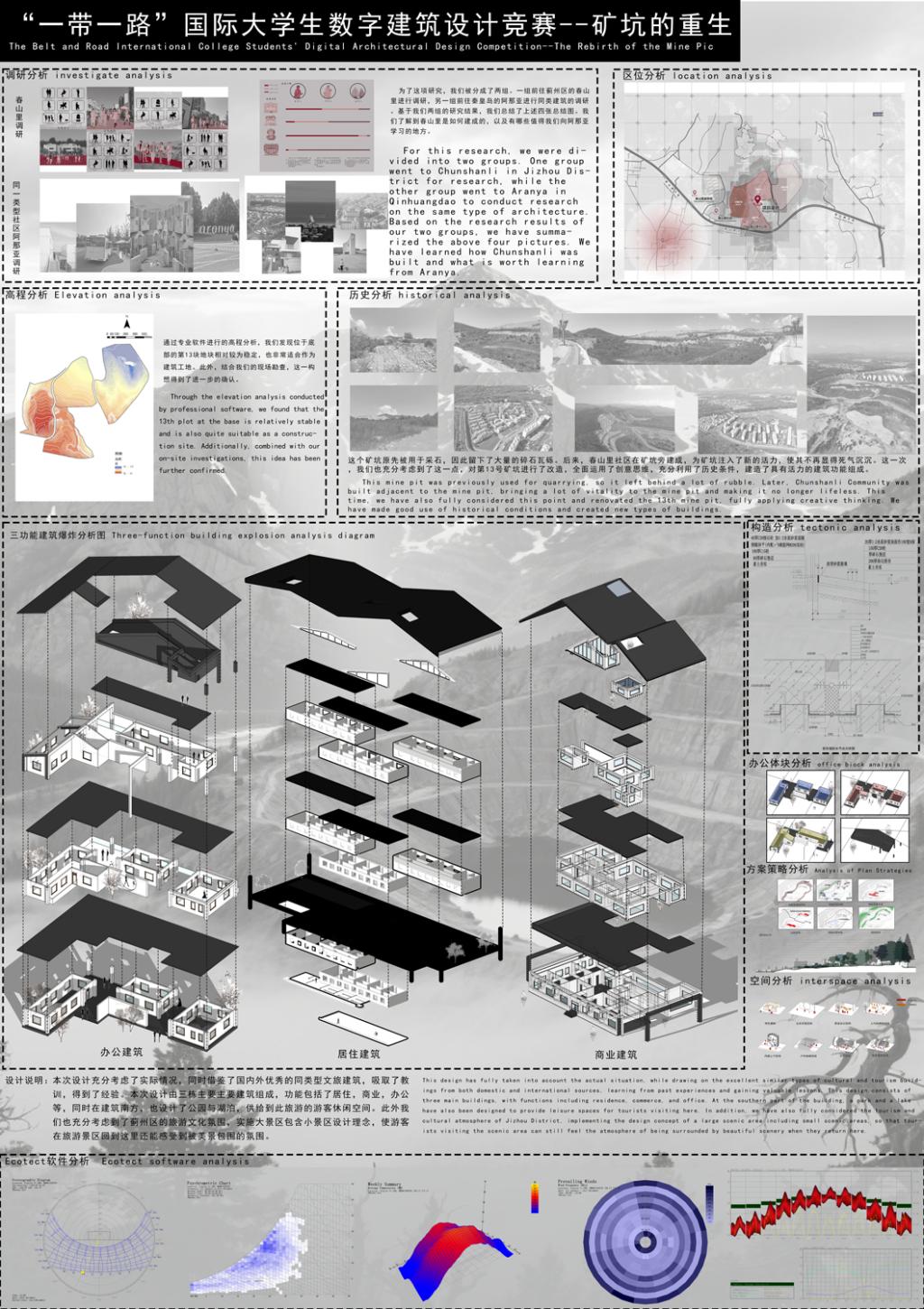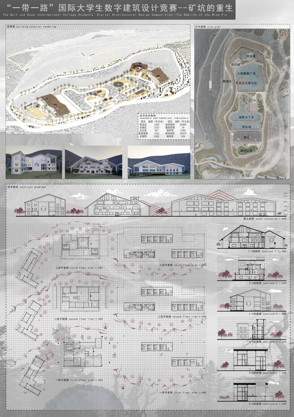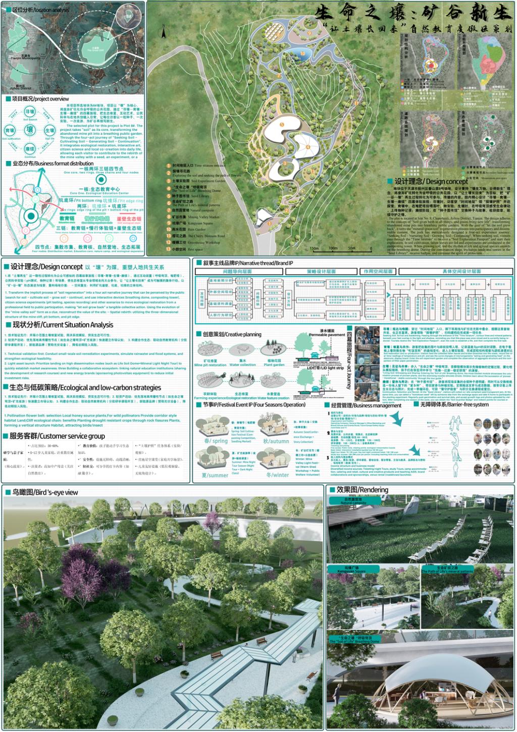 该设计以“生态教育,文化融合”为核心,将废弃矿坑转化为四季运营的公共花园。以“寻壤—育壤—生壤—赓续”串联教育中心、呼吸穹顶、矿脉之光、种子图书馆与回声井;以雨水花园与土壤修复展示再生过程,采用就地材料与装配式低碳建造的方式,通过研学、营地与夜游的日夜双线产品,形成强参与、强记忆与复访动力,推动矿谷从“被开采”走向“可生长”。