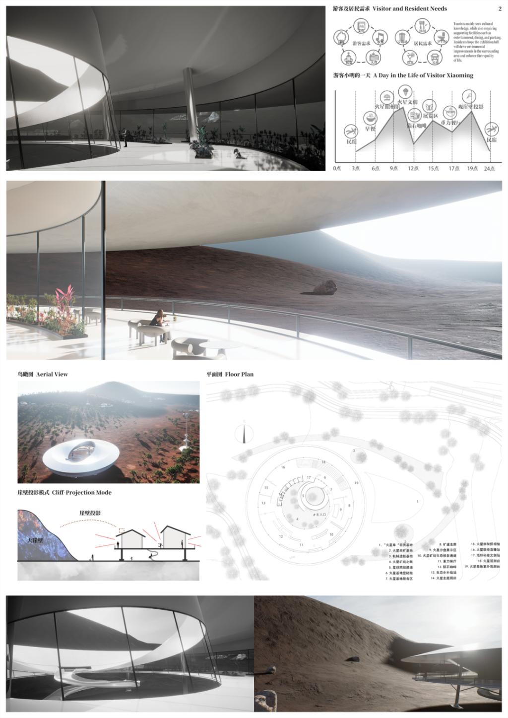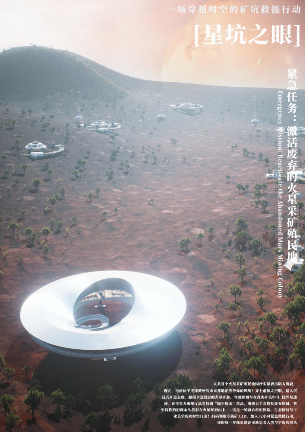 该设计以“激活废弃火星采矿殖民地”为主题,打造集沉浸式体验、科普教育、生态展示与商业运营于一体的未来科幻文旅综合体。设计通过重构火星采矿基地的叙事场景,将室内展示空间与户外体验动线有机融合。设置矿道走廊、矿坑生态通道、火星照相馆、直播站和补给文创站等一系列功能讲述火星地貌与未来改造。通过AR互动与场景叙事,打造成为京津冀地区独具特色的"火星主题生态引流示范基地",实现文化、教育与商业的多元统一。