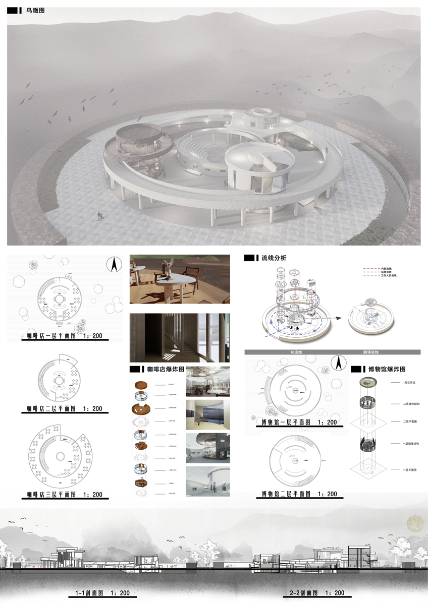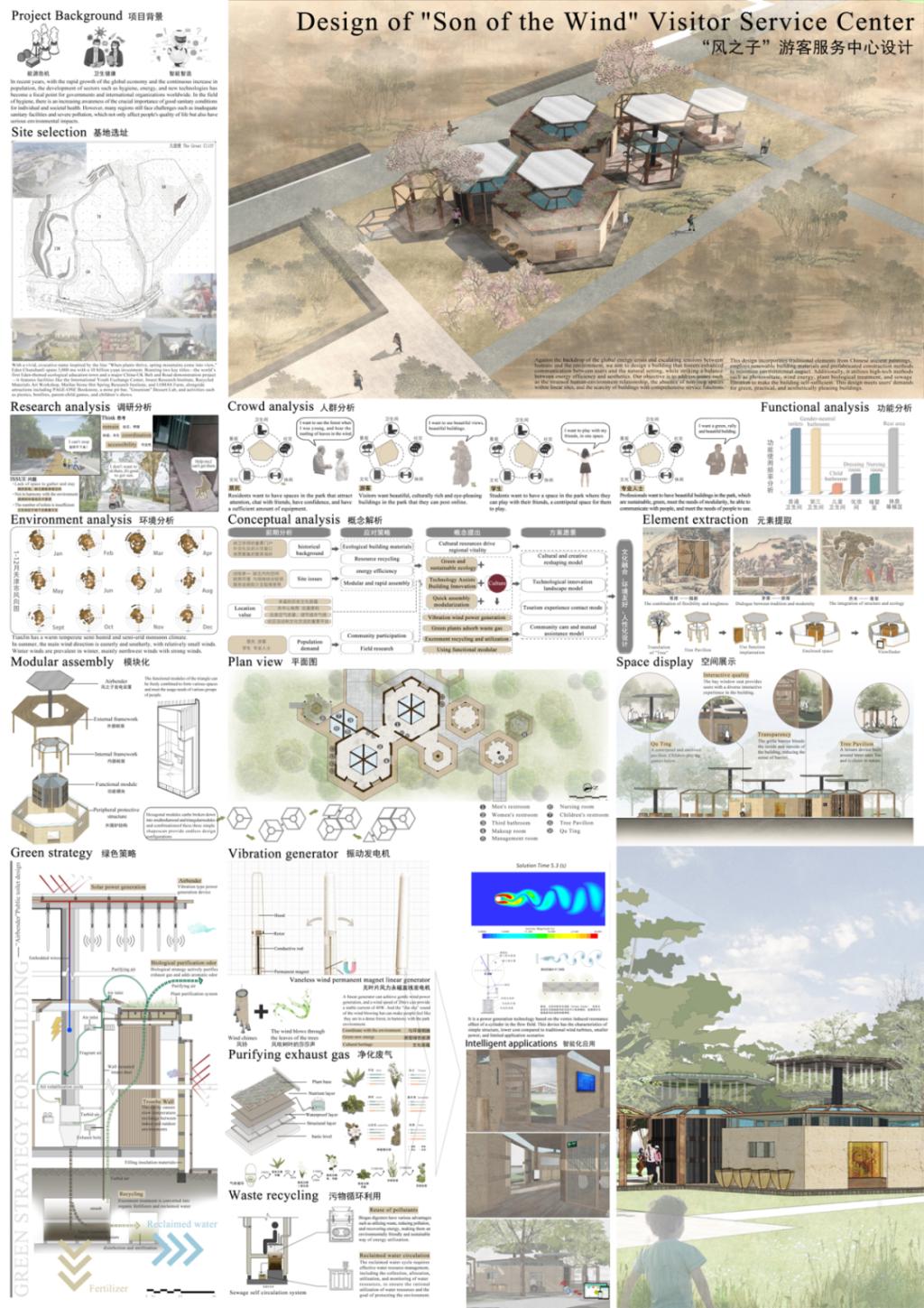 该设计基于全球能源危机和人类与环境之间日益紧张的背景,旨在设计一座能够促进用户与自然环境之间更好沟通的建筑,同时在能源效率与美学之间取得平衡。聚焦人类与环境关系紧张、线性场地内缺乏不间断空间以及缺少具有全面服务功能的建筑等问题,设计融入了中国古代绘画的传统元素,采用可再生建筑材料和预制建筑方法以最小化环境影响。此外,利用光伏、风能、植物生物处理和污水过滤等高科技手段使建筑实现自给自足,满足用户对绿色、实用且美观建筑的需求。