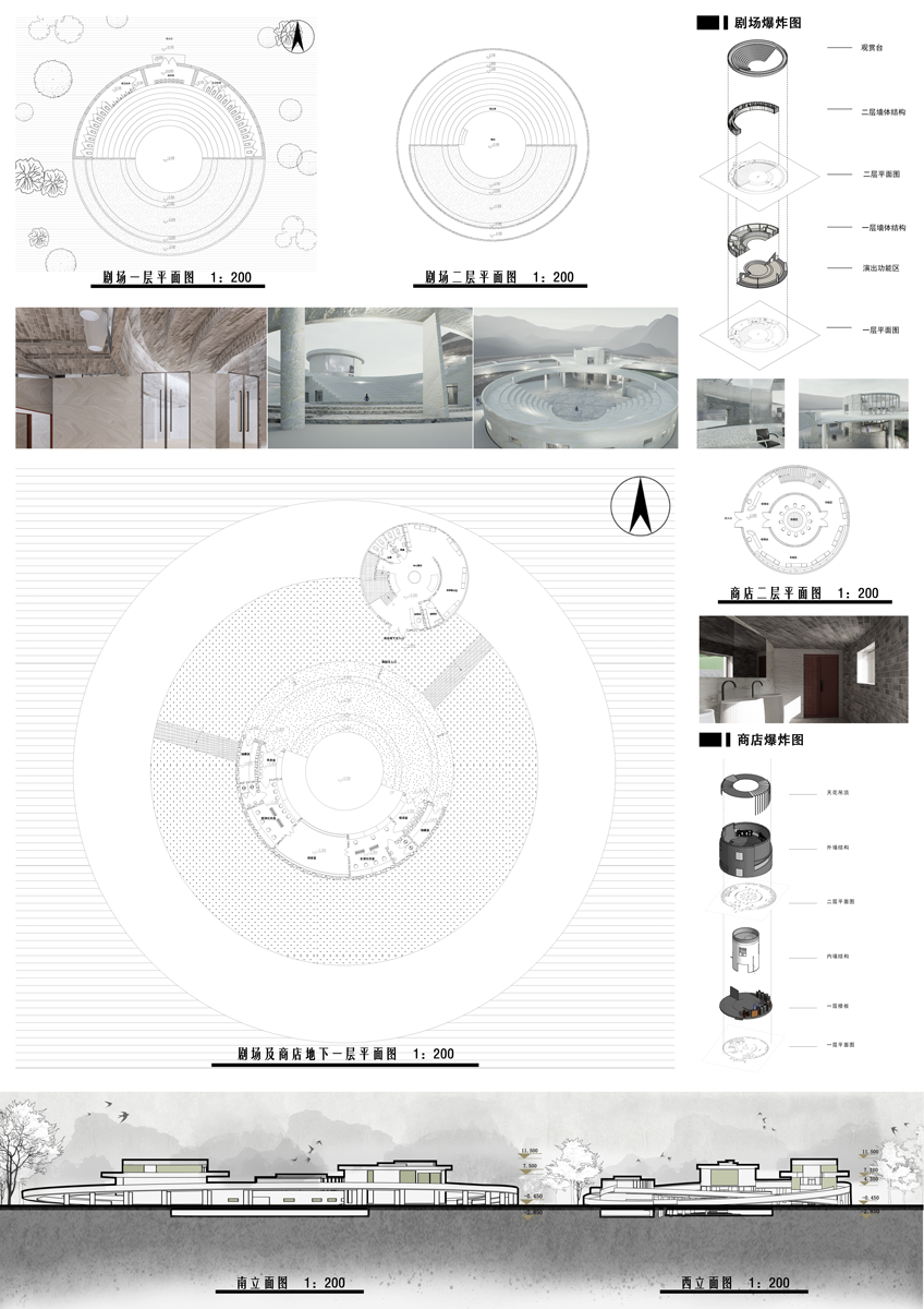 该设计以“天地共融,人文共生”为理念,于蓟州山水间构环形聚落。露天剧院居中,纳自然声光为演出背景,与天地对话;周边咖啡厅、博物馆、商店依环形布局,借流畅动线串联日常闲逸、历史回溯与消费体验,让建筑成为自然与人文交融的载体,在山水环抱中,营造可赏、可感、可参与的复合空间,重塑在地生活与游览的诗意场景 。