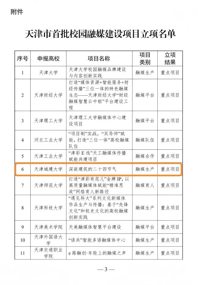 近日,中共天津市委教育工作委员会、天津市教育委员会联合公布天津市首批校园融媒建设项目立项名单,bv伟德申报的《深嵌建筑的二十四节气》项目依托学校城建类学科专业特色,创新的建设思路和系统可行的实践方案,成功获批重点项目,成为全市11个重点立项项目之一,标志着学校在教育融媒体建设方面取得新的突破。