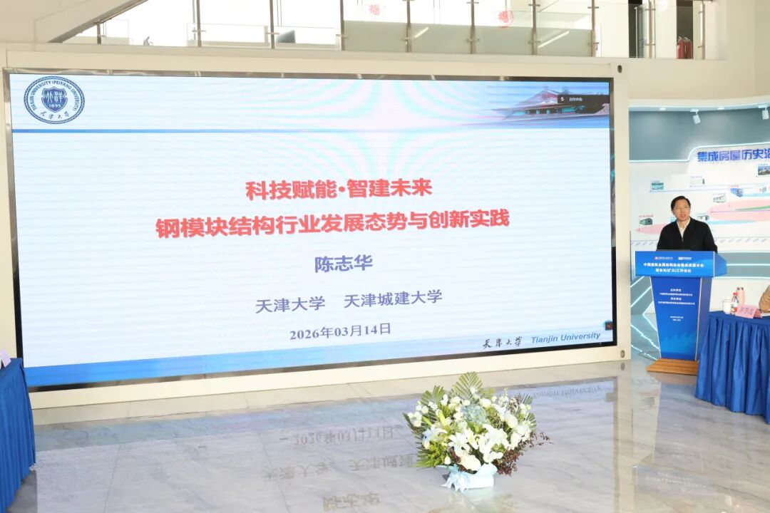 陈志华以《科技赋能·智建未来》为题,结合钢结构模块建筑领域的最新研究成果,从多个维度深入剖析了钢模块结构行业的发展态势与创新实践,阐述了钢模块结构在建筑工业化、绿色建造中的关键作用,以及钢模块结构作为集成房屋的重要技术路径,正迎来前所未有的发展机遇,亟需通过科技创新提升核心竞争力,推动行业转型升级。
