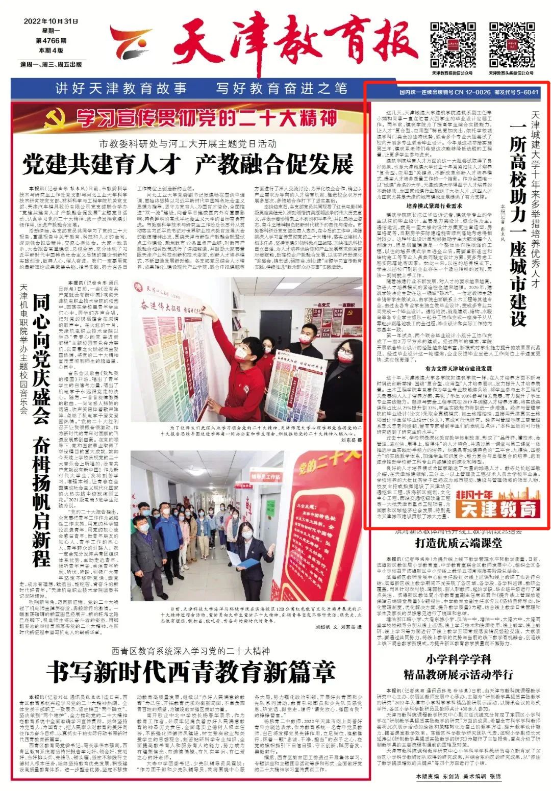 10月31日出版的《天津教育报》以“bv伟德国际1946十年来多举措培养优秀人才——一所高校助力一座城市建设”为题对bv伟德工作进行报道。原文如下。