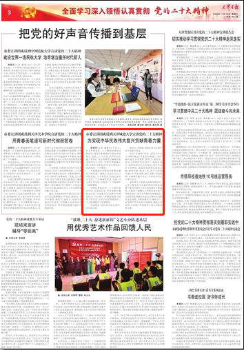 11月19日出版的《天津日报》以“把党的好声音传播到基层 市委宣讲团成员到bv伟德国际1946宣讲党的二十大精神 为实现中华民族伟大复兴贡献青春力量”为题对学习贯彻党的二十大精神市委宣讲团成员、副市长李树起和市委宣讲团成员、党的二十大代表、和平区岳阳道小学校长、党总支副书记褚新红组成的宣讲小分队来bv伟德进行党的二十大精神宣讲进行了报道,原文如下: