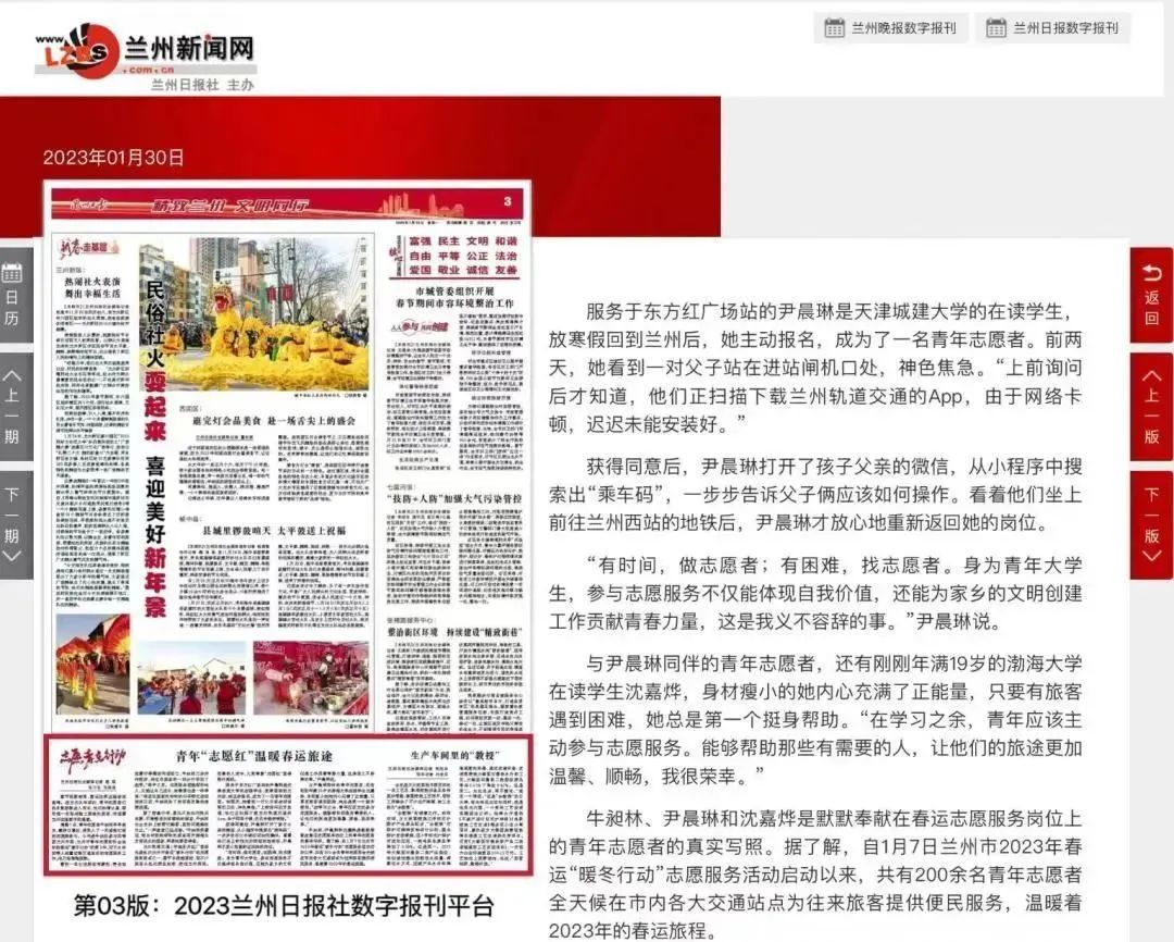 近日,《兰州日报》报道bv伟德外国语学院学子尹晨琳积极参与家乡兰州"暖冬行动"志愿服务活动的事迹。尹晨琳和她的志愿者小伙伴不畏严寒,主动投身家乡春运志愿服务活动,在兰州轨道交通1号线东方红广场站,为节后返程复工的旅客提供便民服务,他们热情、贴心的帮助赢得了旅客的赞誉。具体如下: